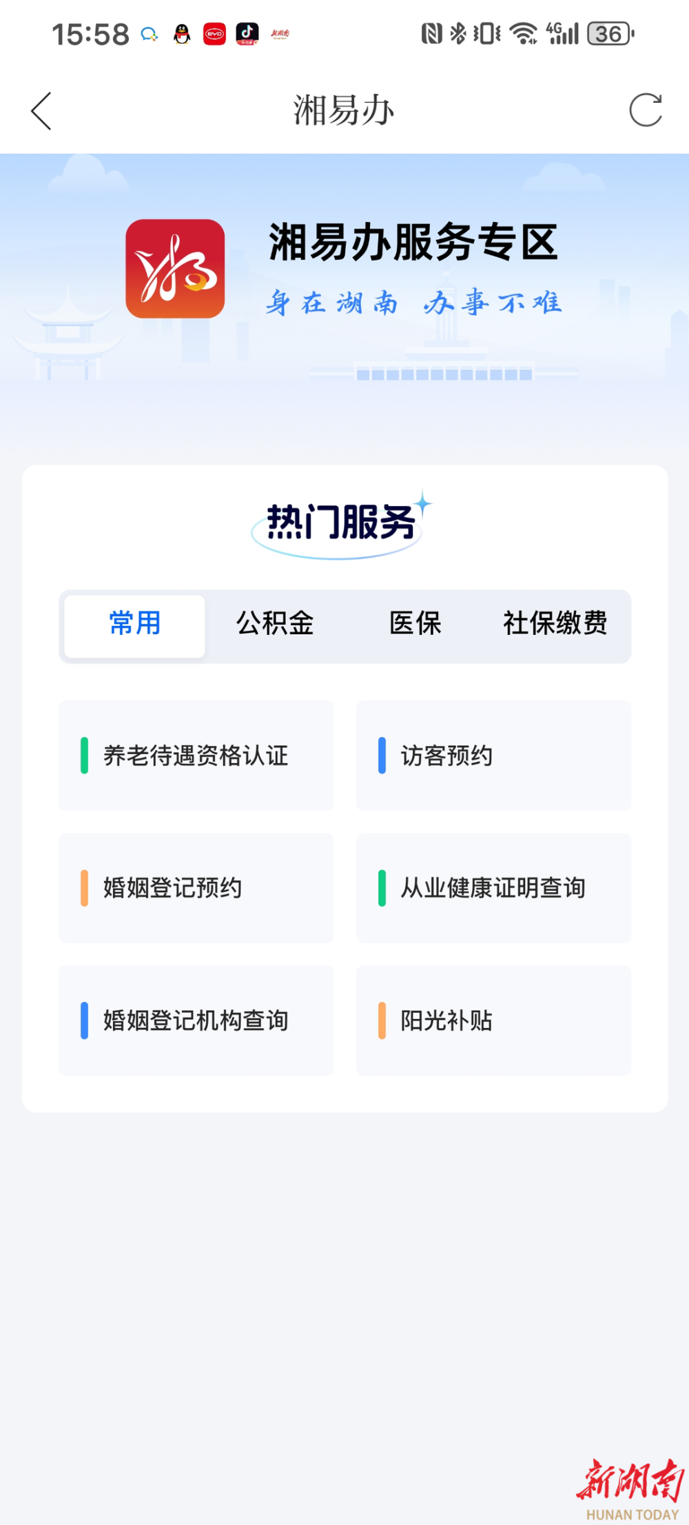 打開新湖南客戶端,在首頁新聞模塊或者服務模塊,即可點擊進入“湘易辦”服務專區。目前,專區已首批集成社保醫保查詢、公積金查詢、養老服務、婚姻登記預約、陽光補貼等21項高頻政務服務。用戶使用已有“湘易辦”賬號一鍵登錄後,無需跳轉,即可完成查詢、辦理、進度追蹤全流程操作。無論是預約前往政府部門辦事,還是查看醫保消費記錄,如今在瀏覽新聞的間隙,動動手指就能輕鬆搞定。