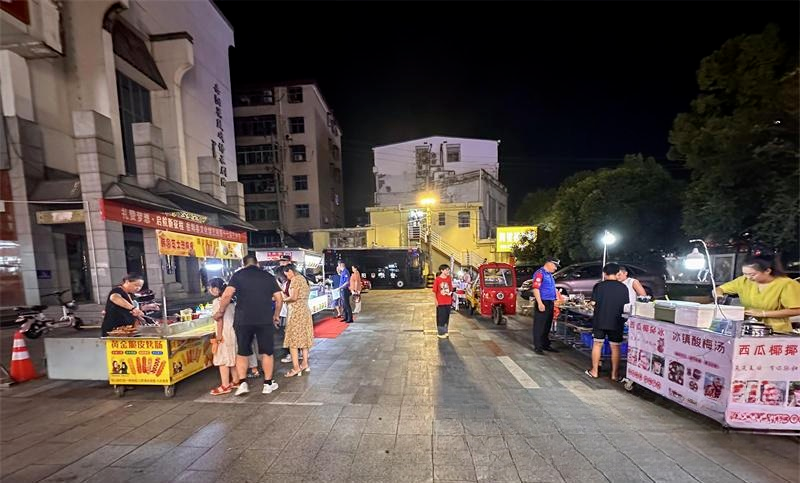 在花鼓戲傳承劇院前,縣城管局工作人員正在向夜市攤主宣傳夜市經營相關管理辦法,叮囑攤主做好經營區衛生管理,隨後,攤主在工作人員的指導下,簽署了“三包”協議。為加強城區流動攤販、夜市經營規範管理,今年來,縣城管局對流動攤販、夜市夜宵經營門店進行“劃行歸市”,在城區劃定了9片“規範經營區”,並製定統一標準,規範管理。在保障經營者安全,不占用盲道、消防通道,不侵害他人利益等前提下,鼓勵流動攤販、夜市夜宵經營門店在指定區域的可經營時間內販賣經營。