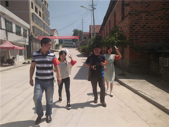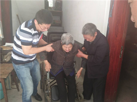 工作人員頂著烈入鄉村開展誌願助殘活動