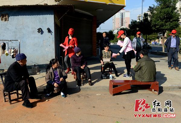 11-3,嶽陽縣委宣傳部組織十多名機關幹部職工到城南社區,開展文明宣傳活動。活動中,誌願者們向臨街門店、社區居民發放文明創建相關宣傳資料和《致廣大市民的一封信》,並與社區居民拉家常,詢問生活環境及對創建文明縣城的意見和建議,同時倡導大家積極行動起來,做到講文明禮儀,講誠信道德、講互助友愛,爭做一個文明榮城人。