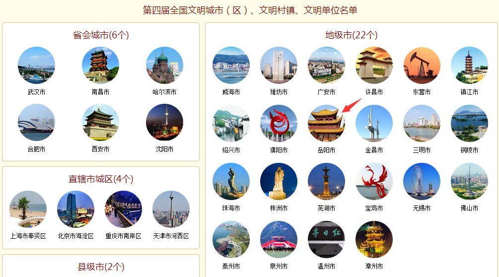 嶽陽被評為第四屆全國文明城市。2-28下午,全國精神文明建設工作表彰暨學雷鋒誌願服務大會在北京人民大會堂隆重舉行。 嶽陽市委書記卿漸偉出席會議。大會召開前夕,習近平總書記親自會見全體與會代表,與榮獲第四屆全國文明城市的34位代表一一握手,集體合影, 並發表了重要講話。卿漸偉親耳聆聽總書記的殷殷囑托,上台領獎,從中央領導人手中捧回了全國文明城市的獎牌。