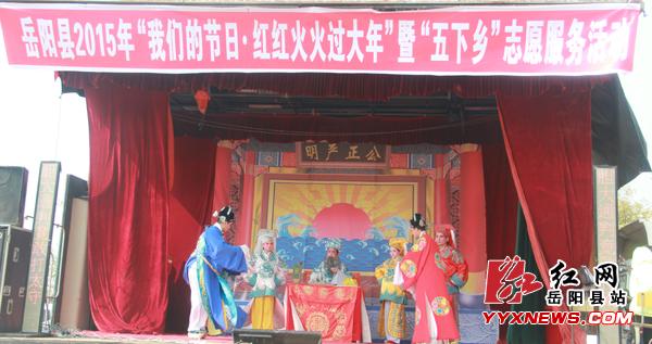 2-5,黃沙街鎮中心小學操場上熱鬧非凡,一台精彩的戲曲表演和理論、法律政策、文化、科技、衛生計生於一體的嶽陽縣2015-“关键词2的節?紅紅火火過大-”暨“五下鄉”誌願服務活動在這裏隆重啟幕。縣委宣傳部、縣文明辦、縣委黨校、婦聯、文廣新、文聯、民政、衛生等19個部門單位,組成了10餘支誌願服務小分隊開展為民服務,讓四麵八方趕來的農民群眾在寒冷的冬裏感受到了陣陣暖意。
