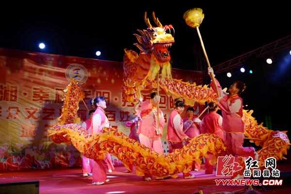 在激昂、歡快的鑼鼓聲中,衛農社區大媽們組成的舞龍隊閃亮登場,金黃的中國龍在大媽們的手中自由翻滾,時而盤起,時而俯衝,變化萬千,充分展示了龍的精氣神韻。隨後登台表演的歌舞《舞動春天》、女聲獨唱《喜氣洋洋》、音樂快板《文明花開城關鎮》、歌伴舞《中國夢》、花鼓戲《補背褡》、說唱《喜看今新榮城》等14個形式多樣的精彩節目博得現場觀眾一致好評。