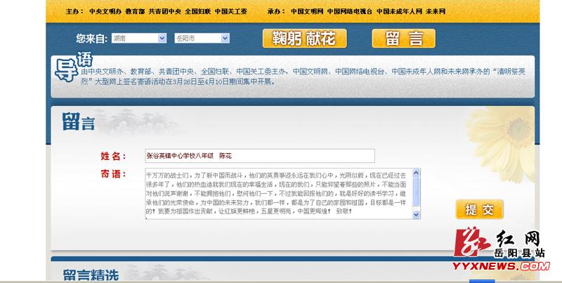 三、網上祭英烈活動。在廣泛組織未成-人開展實地祭奠先烈活動的同時,各學校還紛紛組織學生登陸中國文明網進行“網上祭英烈”活動,通過在專題網站上向先賢先烈鞠躬獻花、抒寫感言寄語,表達廣大青少-學生對英烈的感恩和敬仰之情。據統計,清明節期間,全縣共有3萬餘學生參與了“網上祭英烈”活動。