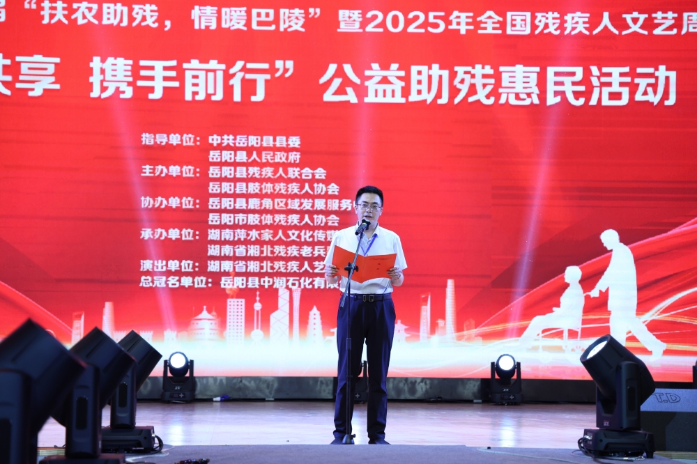 6月28日晚,由嶽陽縣殘聯、嶽陽縣肢殘協會聯合主辦的2025年全國殘疾人文化周暨第二屆“扶農助殘·情暖巴陵”公益助殘惠民活動在嶽陽縣一中體育館隆重舉行。嶽陽市殘聯黨組書記周擁軍、嶽陽縣人民政府副縣長張文毅出席活動。
