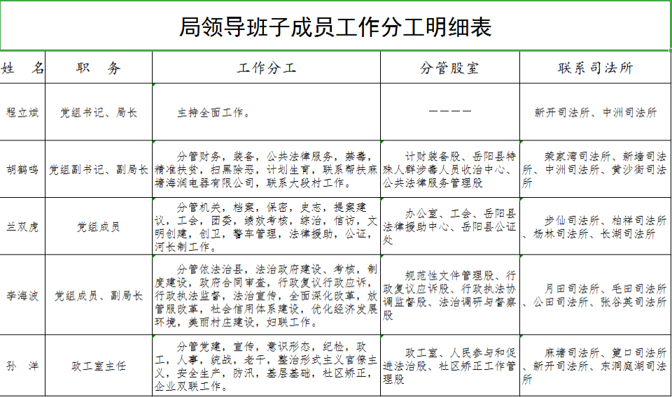 《局領導班子成員工作分工明細表》已經局黨組集體研究同意,現印發給你們,請認真做好工作對接和工作匯報。