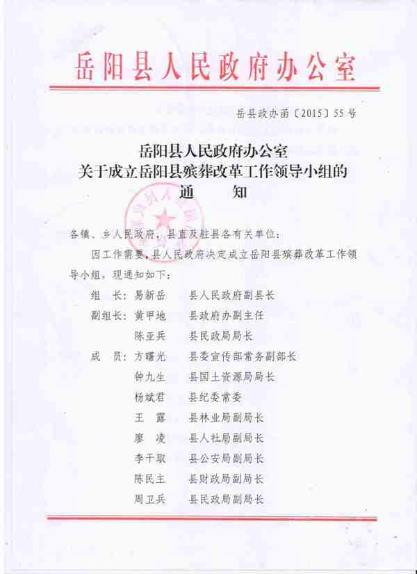 關於成立嶽陽縣殯葬改革工作領導小組的通知