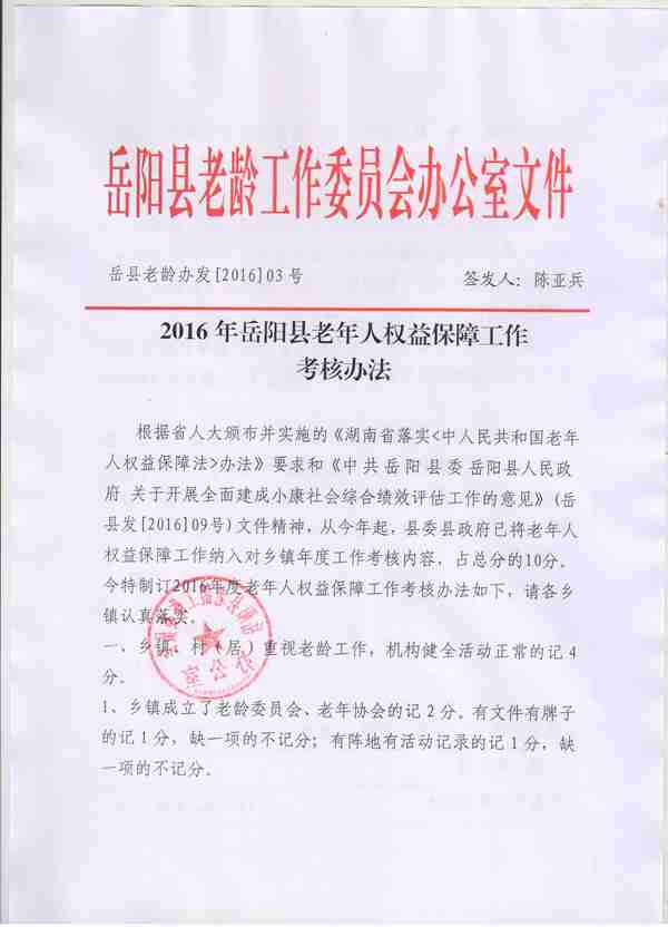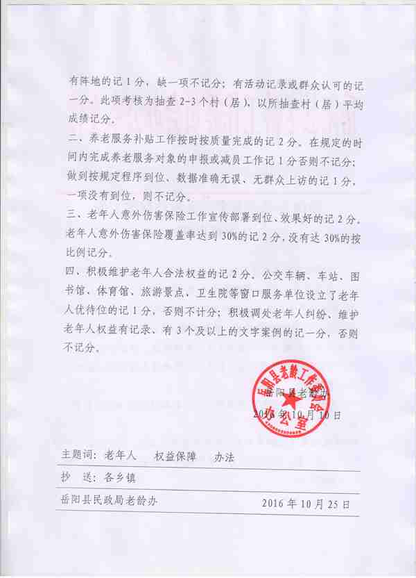 2016年嶽陽縣老年人權益保障工作考核辦法