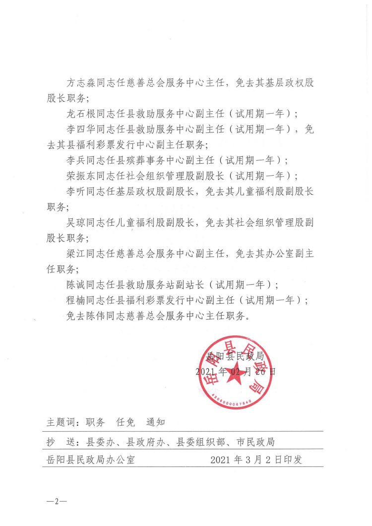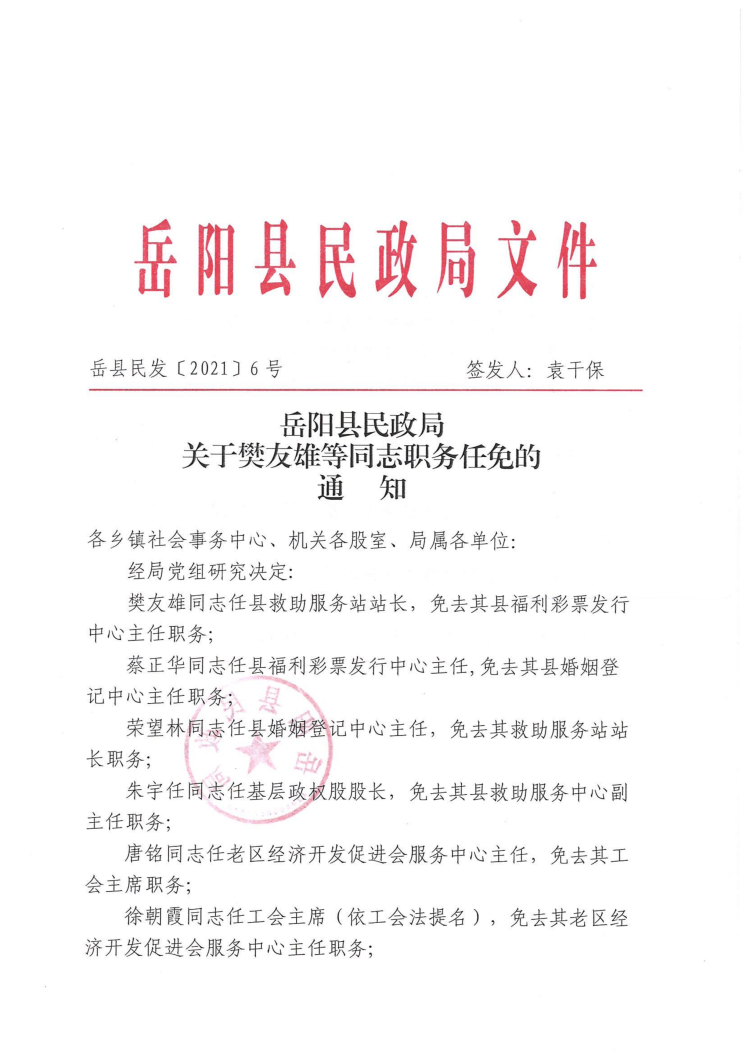 嶽陽縣民政局關於樊友雄等同誌職務任免的通知