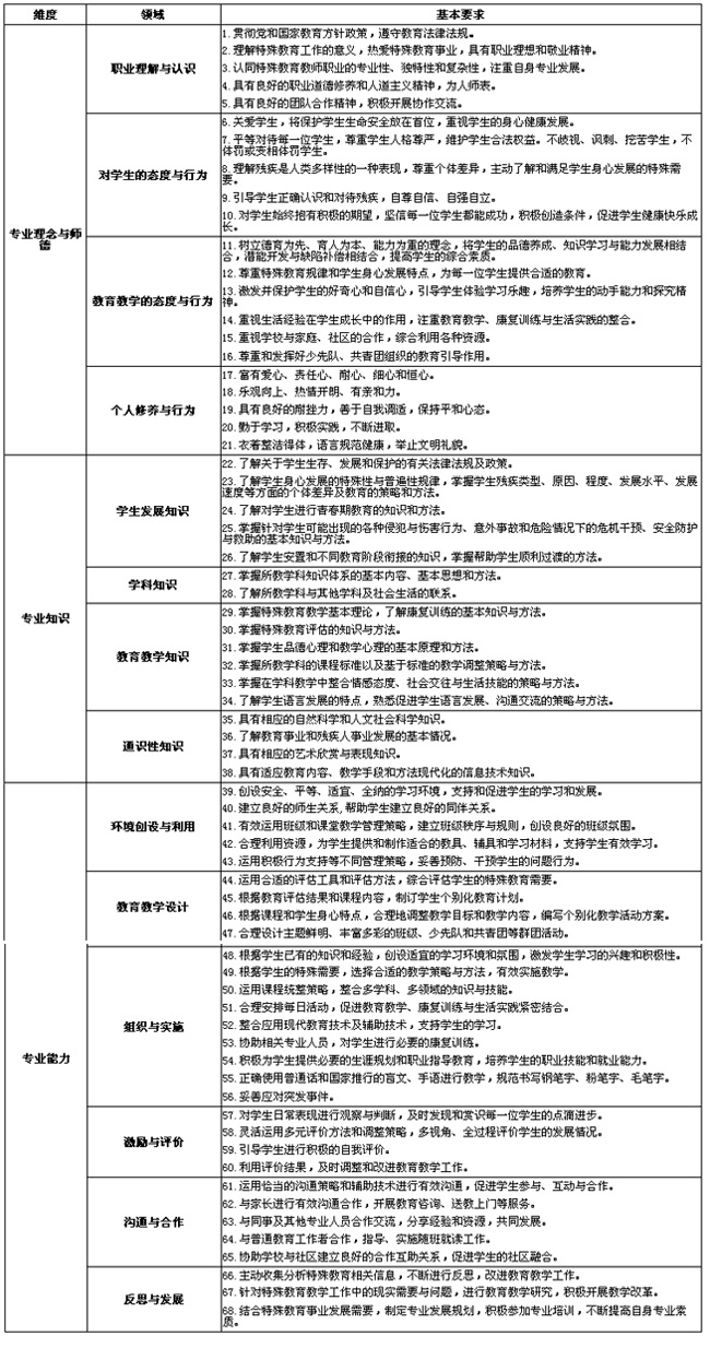 特殊教育教師是指在特殊教育學校、普通中小學幼兒園及其他機構中專門對殘疾學生履行教育教學職責的專業人員,要經過嚴格的培養與培訓,具有良好的職業道德,掌握係統的專業知識和專業技能。本標準是國家對合格特殊教育教師的基本專業要求,是特殊教育教師實施教育教學行為的基本規範,是引領特殊教育教師專業發展的基本準則,是特殊教育教師培養、準入、培訓、考核等工作的重要依據。