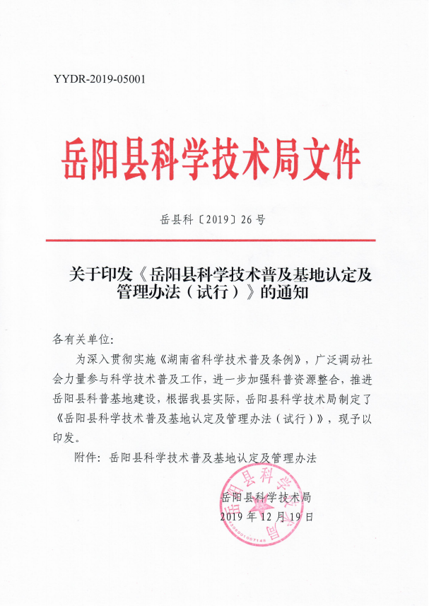 關於印發《嶽陽縣科學技術普及基地認定及管理辦法(試行)》的通知