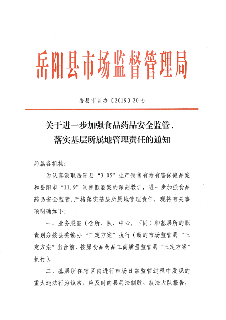 關於進一步加強食品藥品安全監管、落實基層所屬地責任的通知