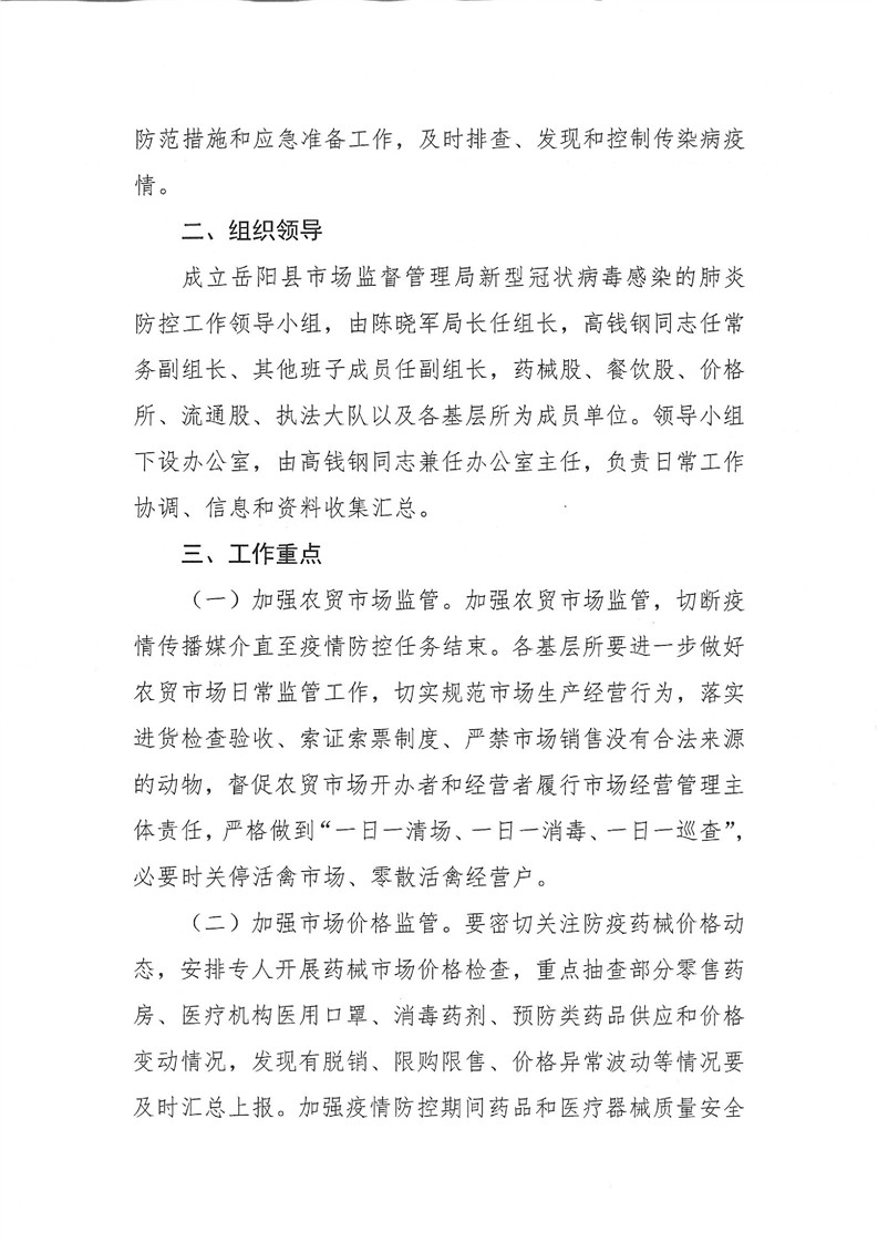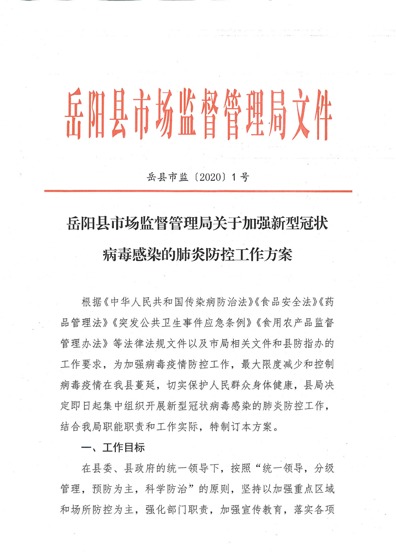 嶽陽縣市場監督管理局關於加強新型冠狀病毒感染的肺炎防控工作方案