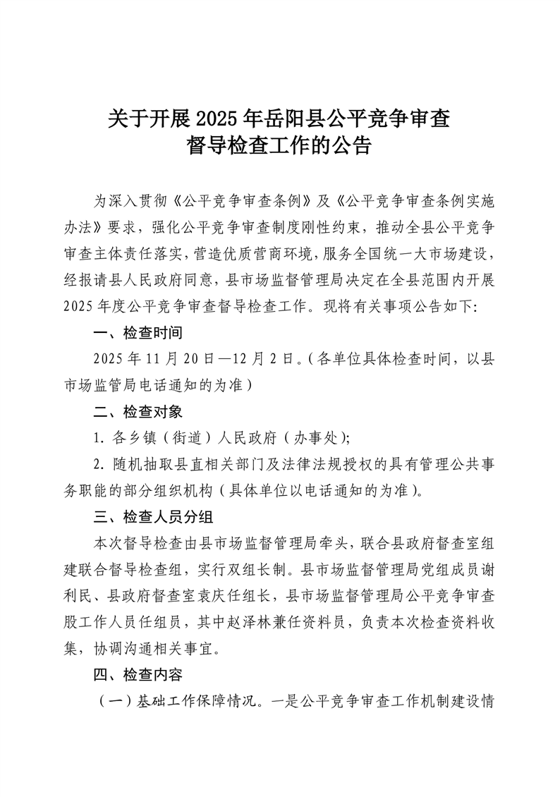 關於開展2025年嶽陽縣公平競爭審查督導檢查的公告