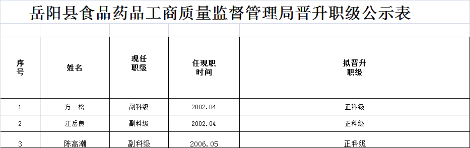 嶽陽縣食品藥品工商質量監督管理局晉升職級公示表