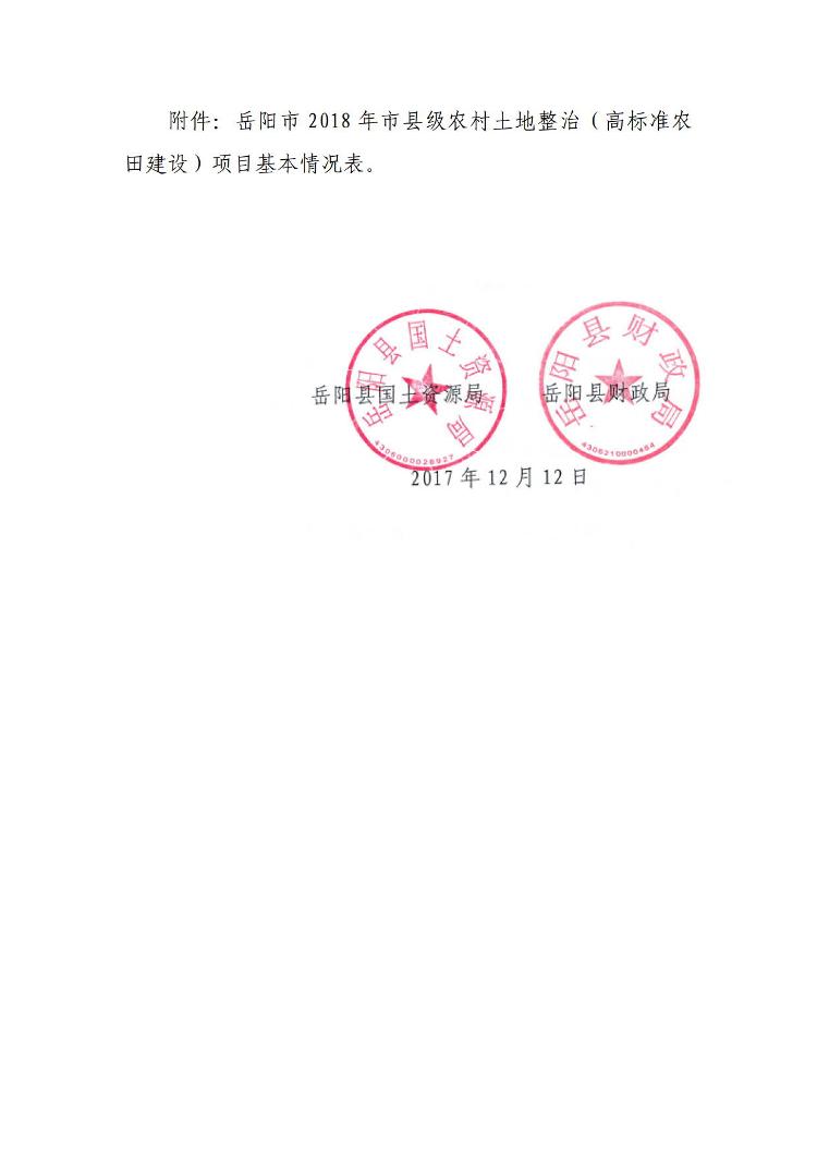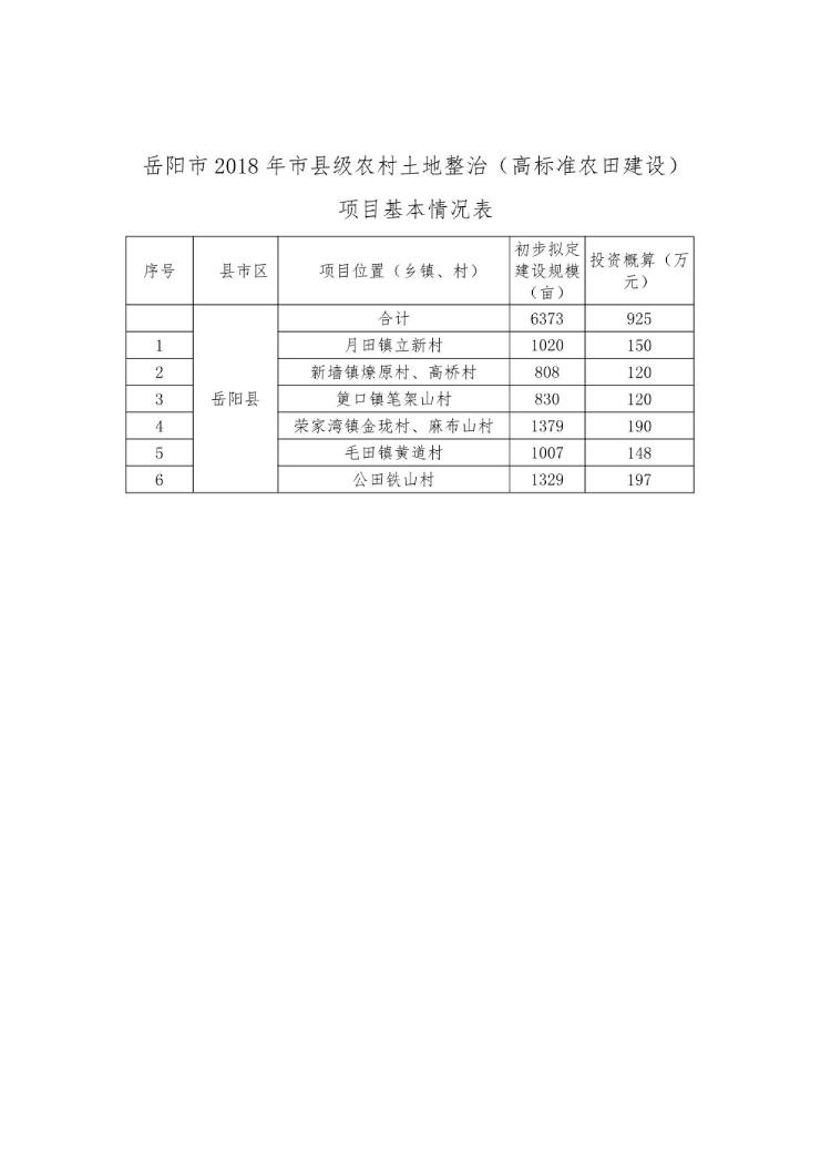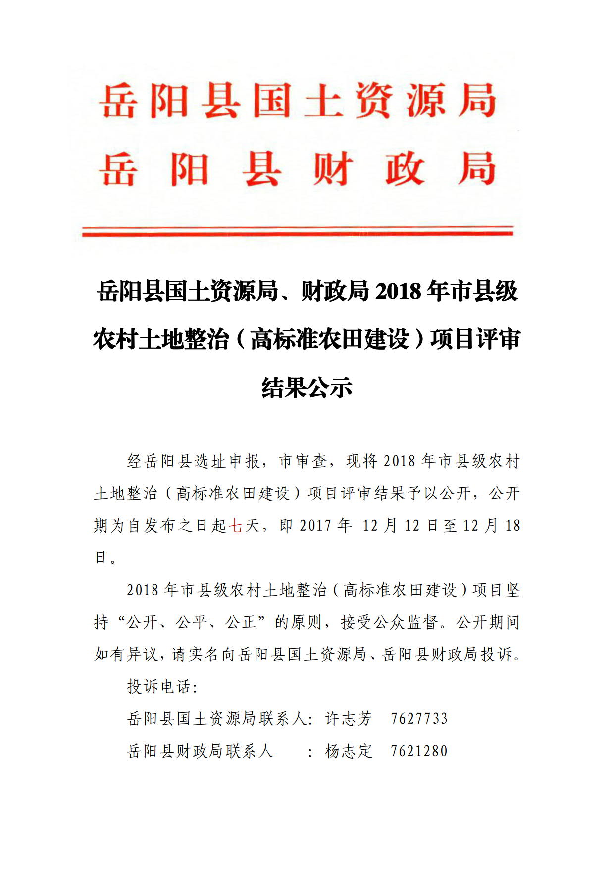 嶽陽縣國土資源局、財政局2018年市縣級農村土地整治(高標準農田建設)項目評審結果公示