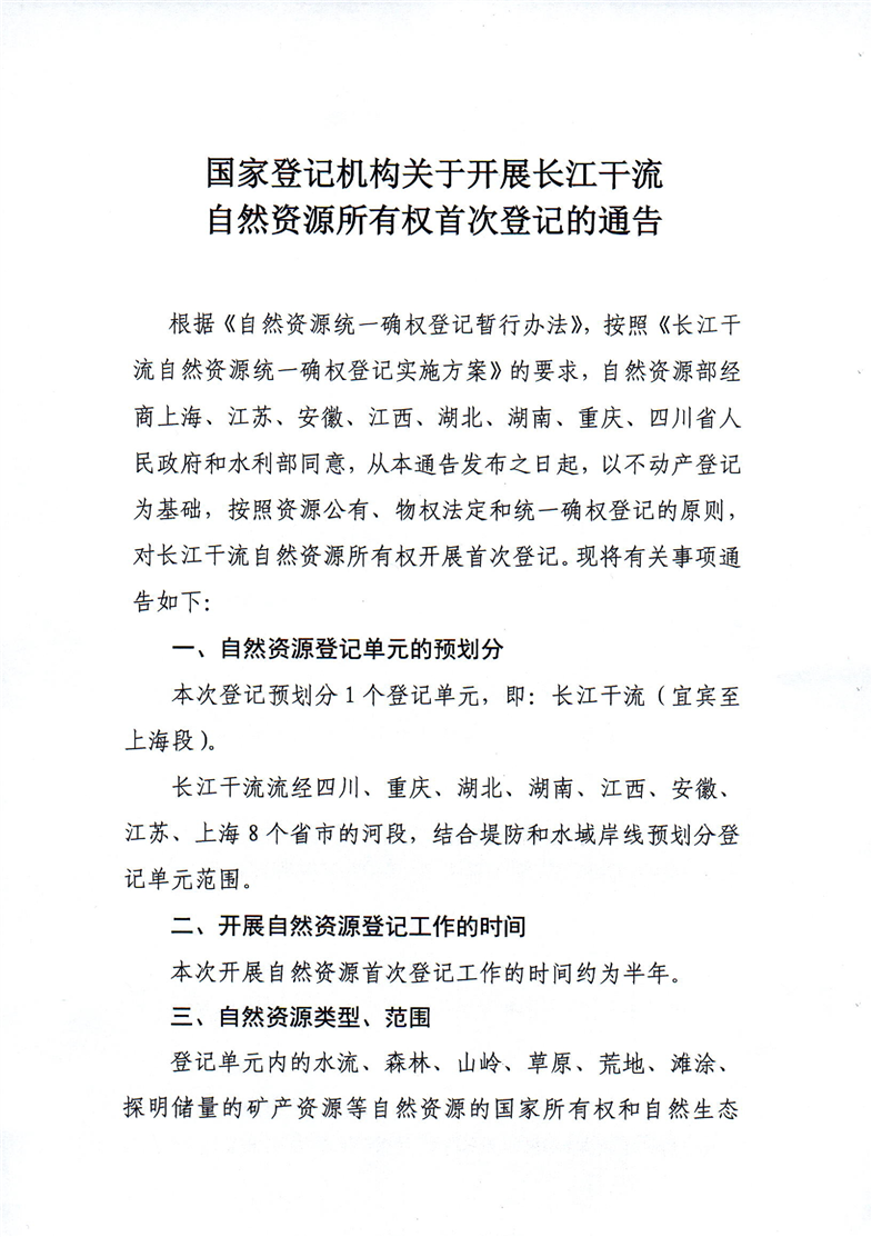 國家登記機構關於開展長江幹流自然資源所有權首次登記的通告