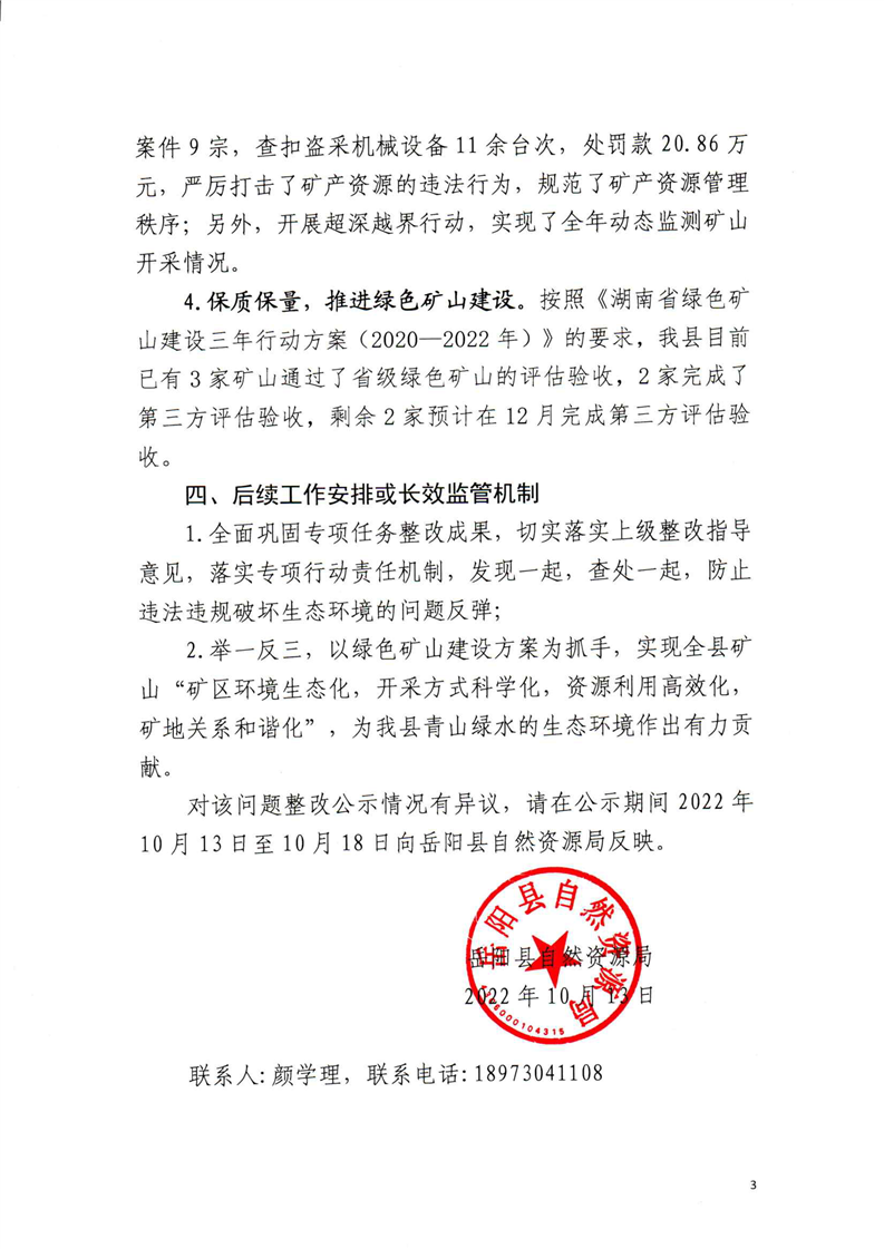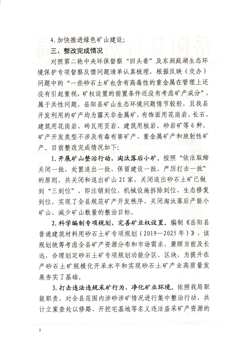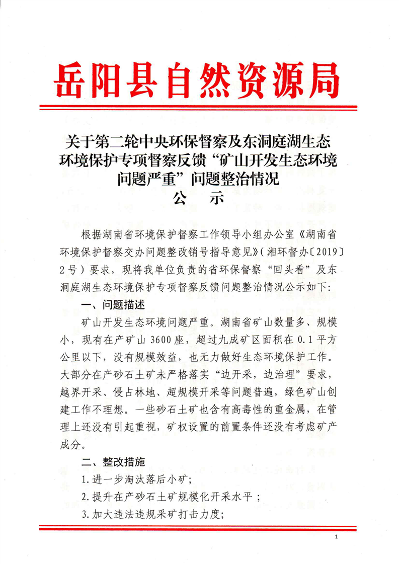 關於第二輪中央環保督察及東洞庭湖生態環境保護專項督察反饋“礦山開發生態環境問題嚴重”問題整治情況公示
