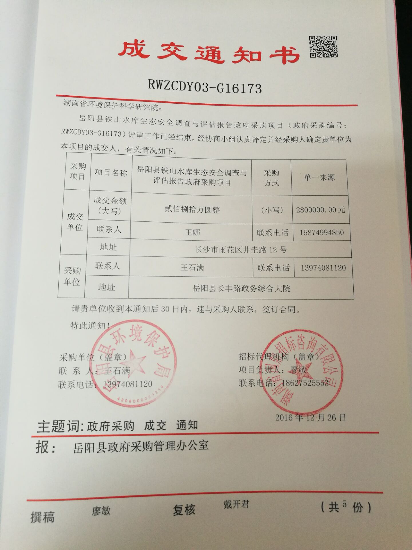 項目成交通知書