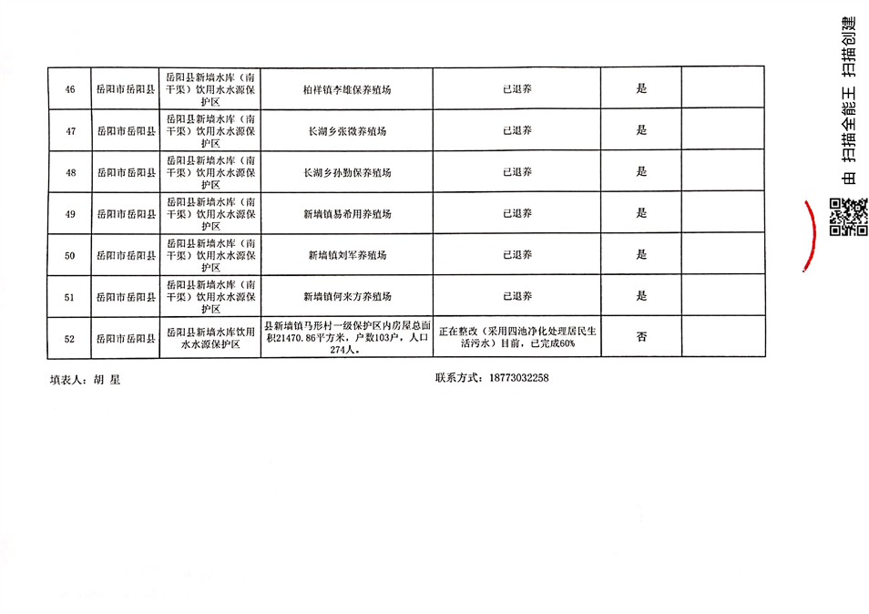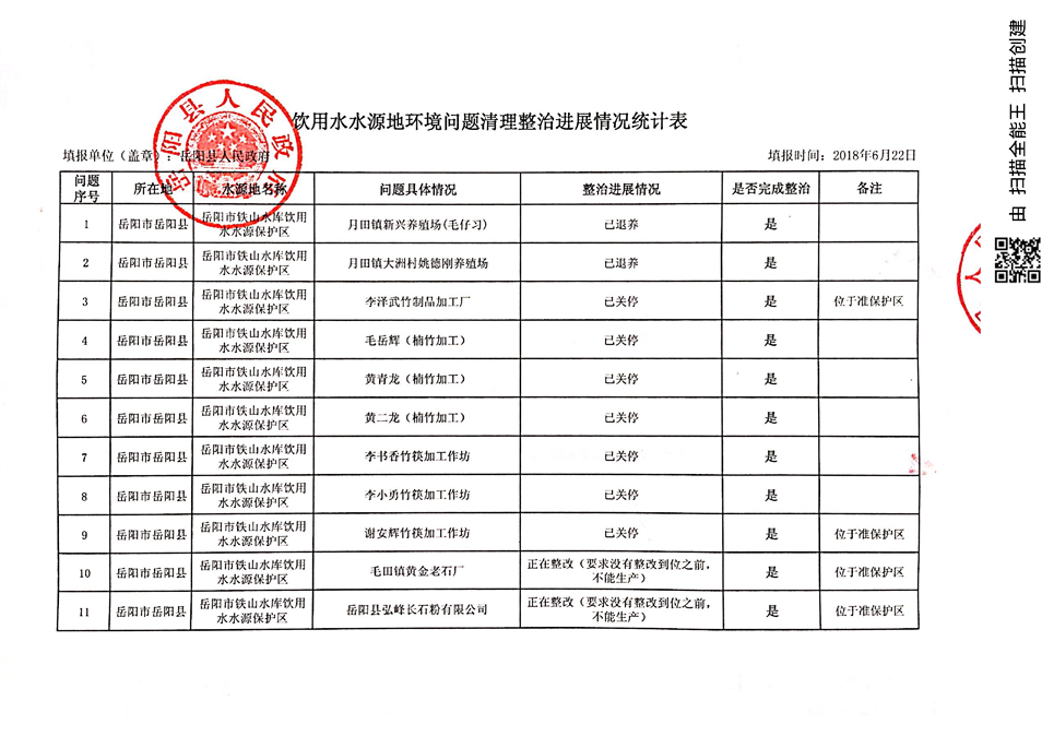 2018年6月飲用水水源地環境問題清理整治進展情況統計表