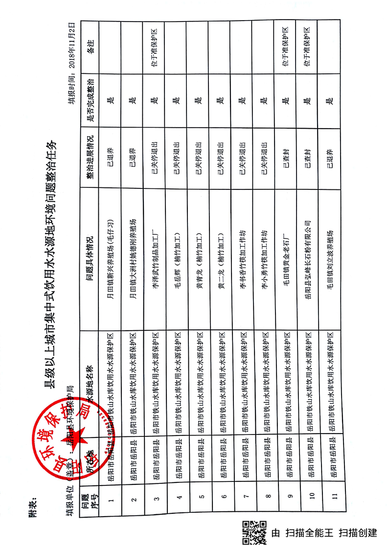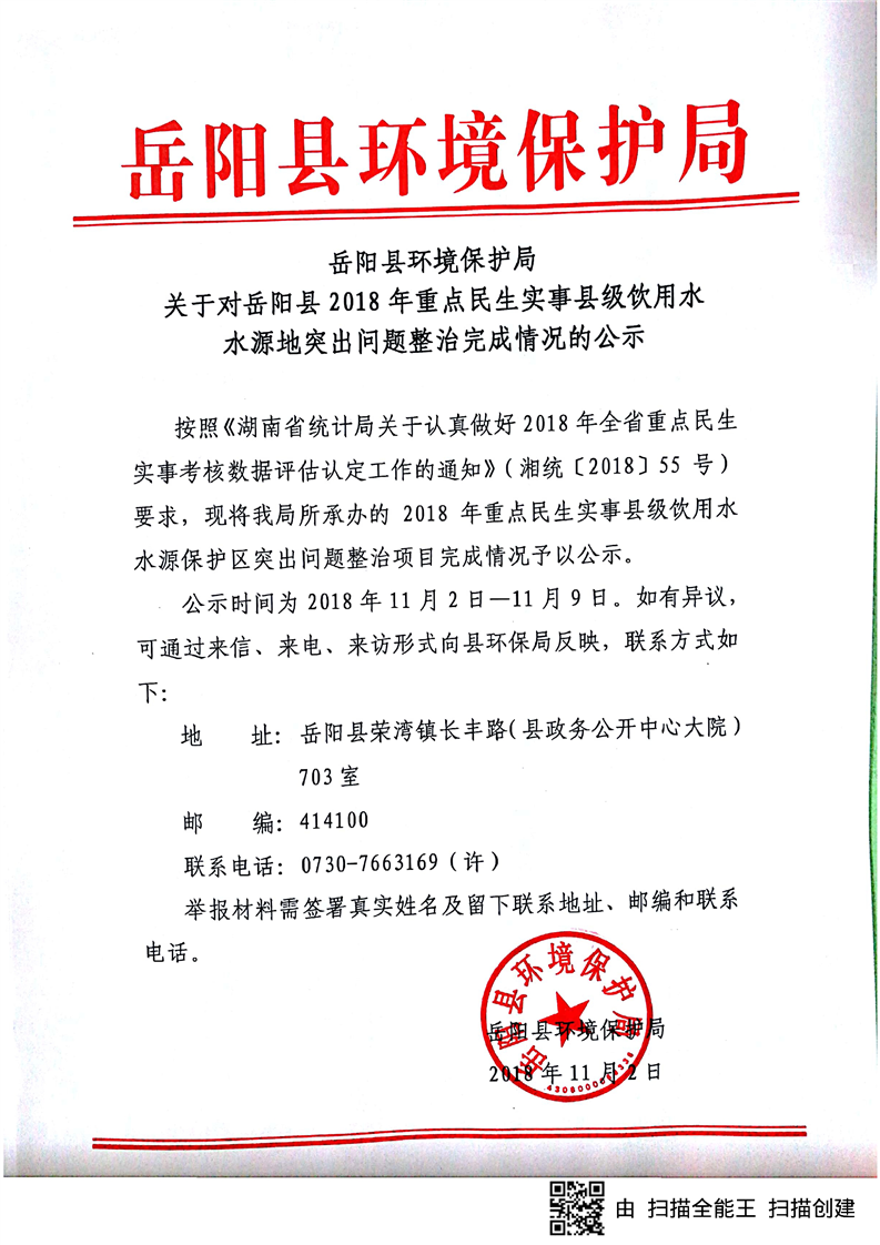 嶽陽縣環境保護局關於對嶽陽縣2018年重點民生實事縣級飲用水水源地突出問題整治完成情況的公示