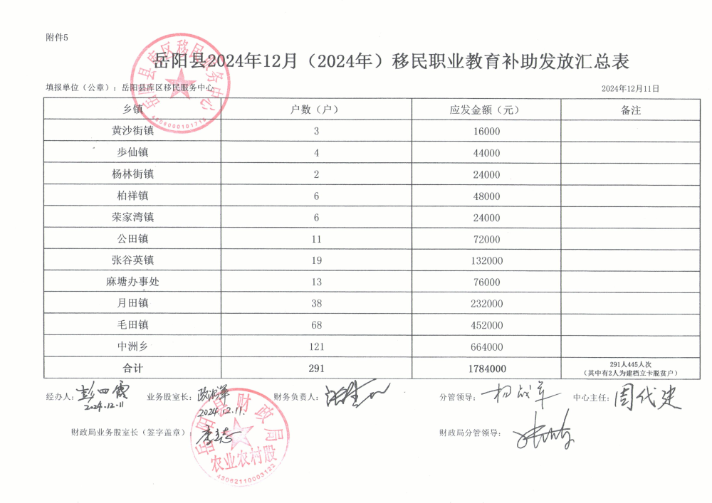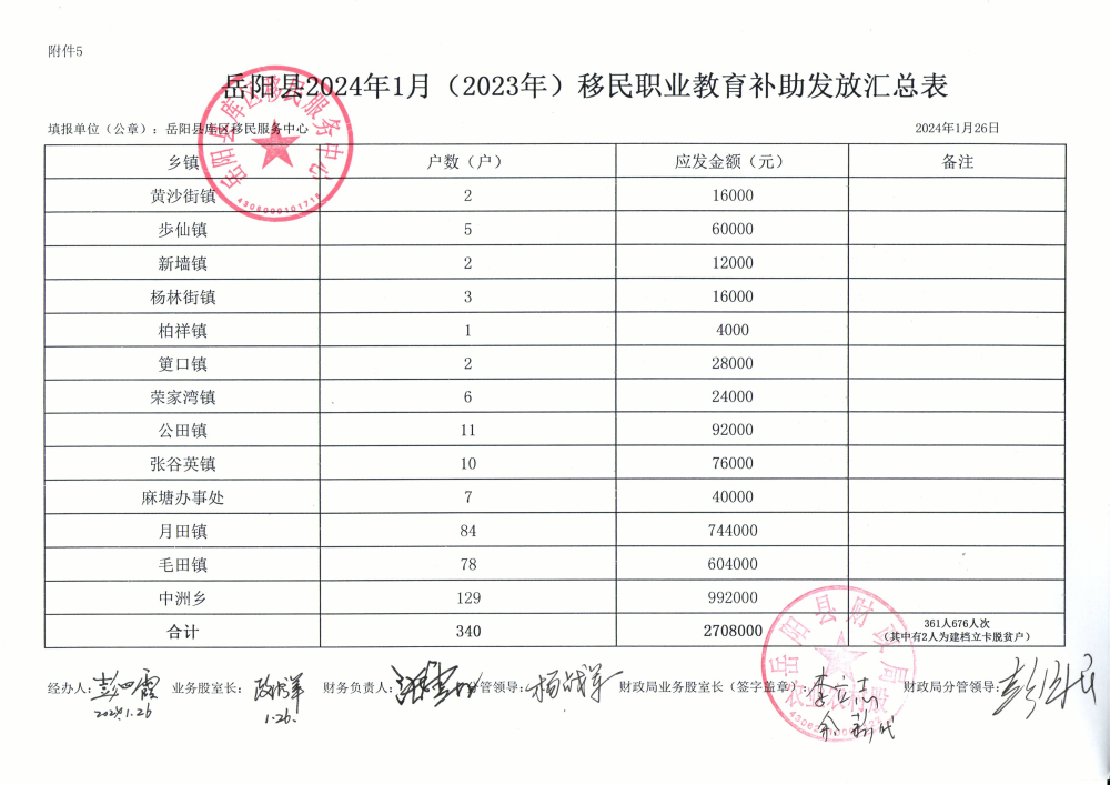 嶽陽縣2024年移民職業教育補助發放匯總表