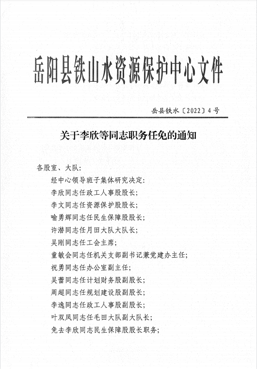 縣鐵山水資源保護中心關於李欣等同誌職務任免的通知