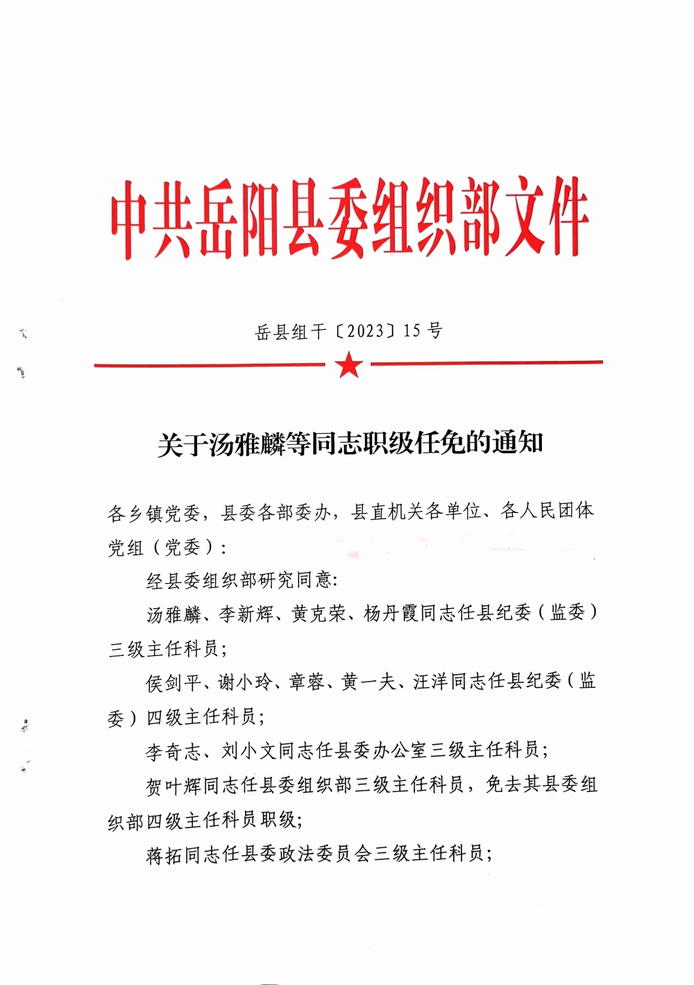 關於湯雅麟等同誌職級任免的通知