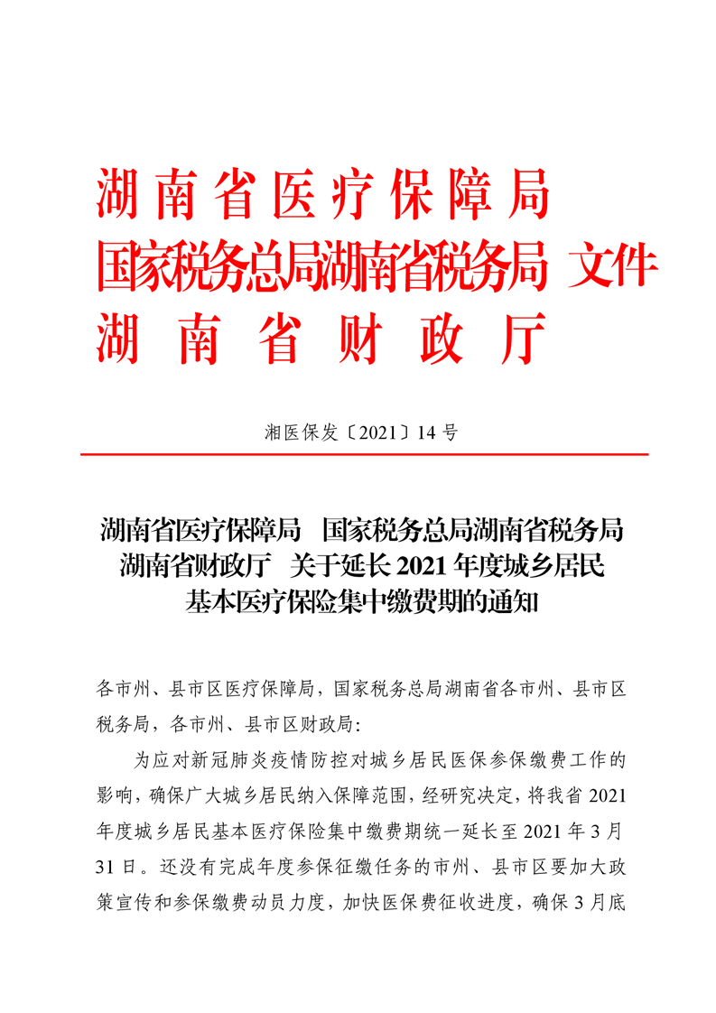關於延長2021年度城鄉居民醫保基本醫療保險集中繳費期的通知 (湘醫保發〔2021〕14號)