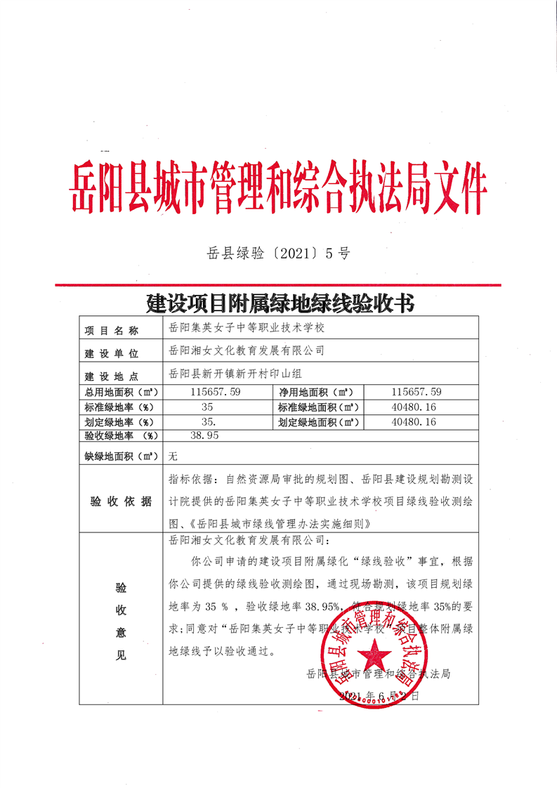 嶽陽集英女子中等職業技術學校建設項目附屬綠地綠線驗收書