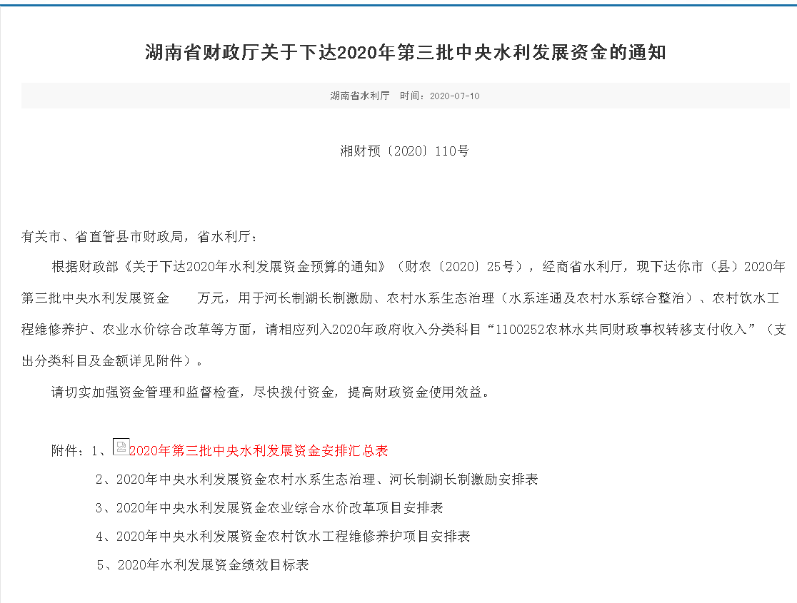 湖南省財政廳關於下達2020年第三批中央水利發展資金的通知