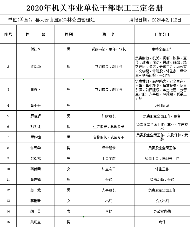 大雲山管理處2020年機關事業單位幹部職工三定名冊