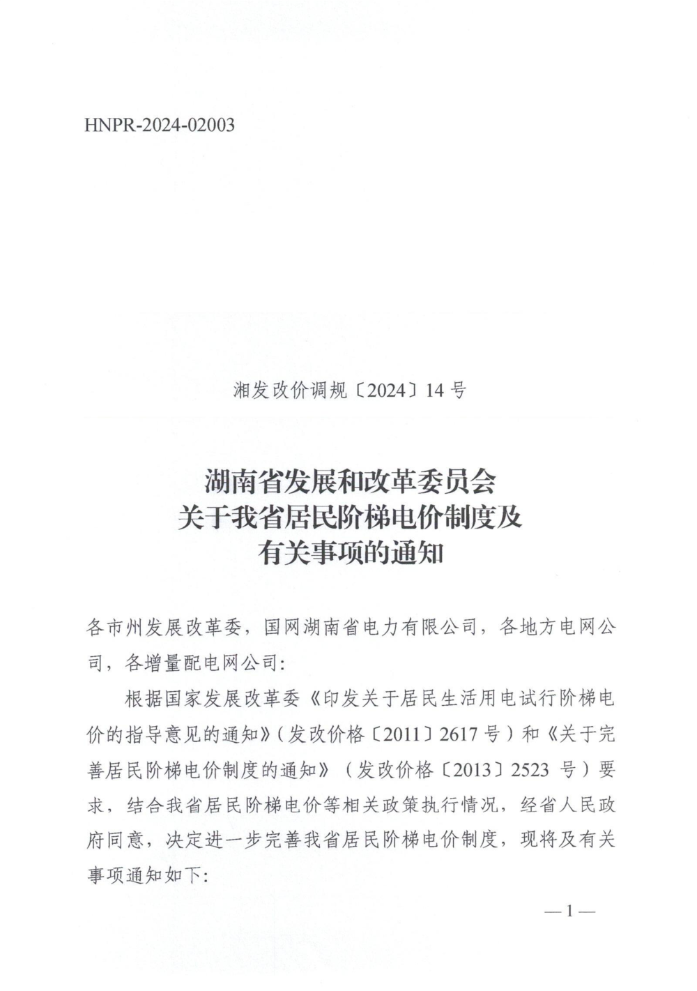 湘發改價調規〔2024〕14 號 關於我省居民階梯電價製度及有關事項的通知