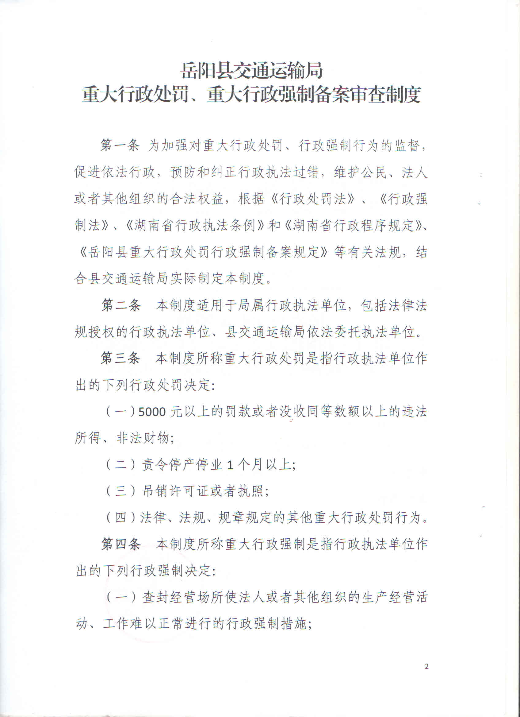 嶽陽縣交通運輸局重大行政處罰重大行政強製備案審查製度