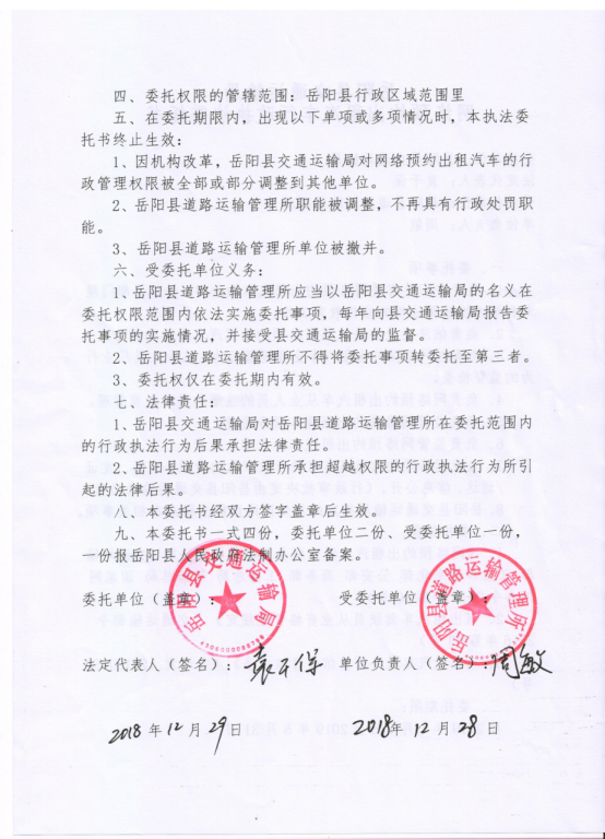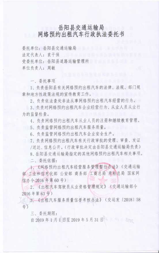 嶽陽縣交通運輸局網絡預約出租汽車行政執法委托書(20090101-20190531)