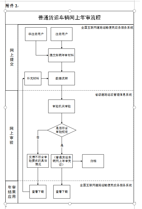 審驗符合要求的,道路貨物運輸經營者可通過全國互聯網道路運輸便民政務服務係統下載《普通貨運車輛網上年審憑證》(參考樣式見附件1)並留存。電子印章(參考樣式見附件1)標注在《普通貨運車輛網上年審憑證》上,由審驗機關加蓋。