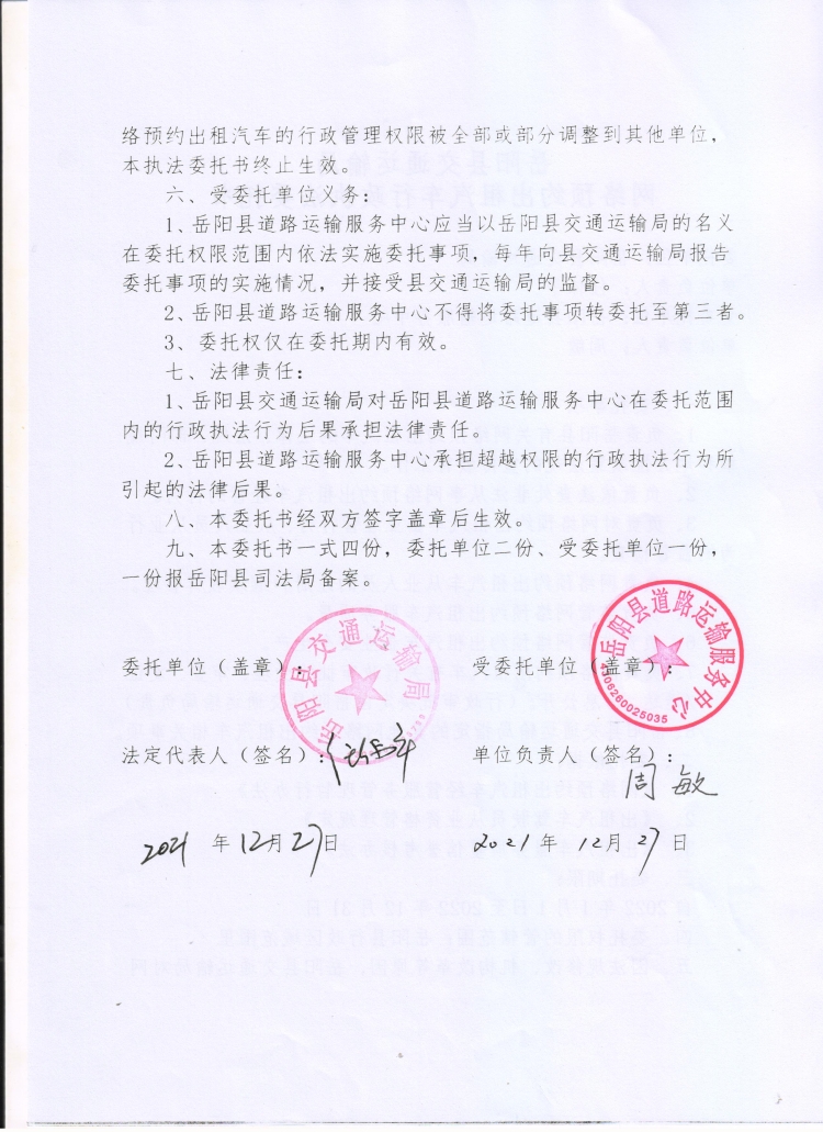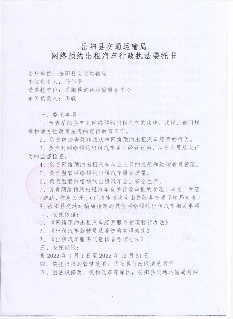 嶽陽縣交通運輸局網絡預約出租汽車行政執法委托書(2022年)