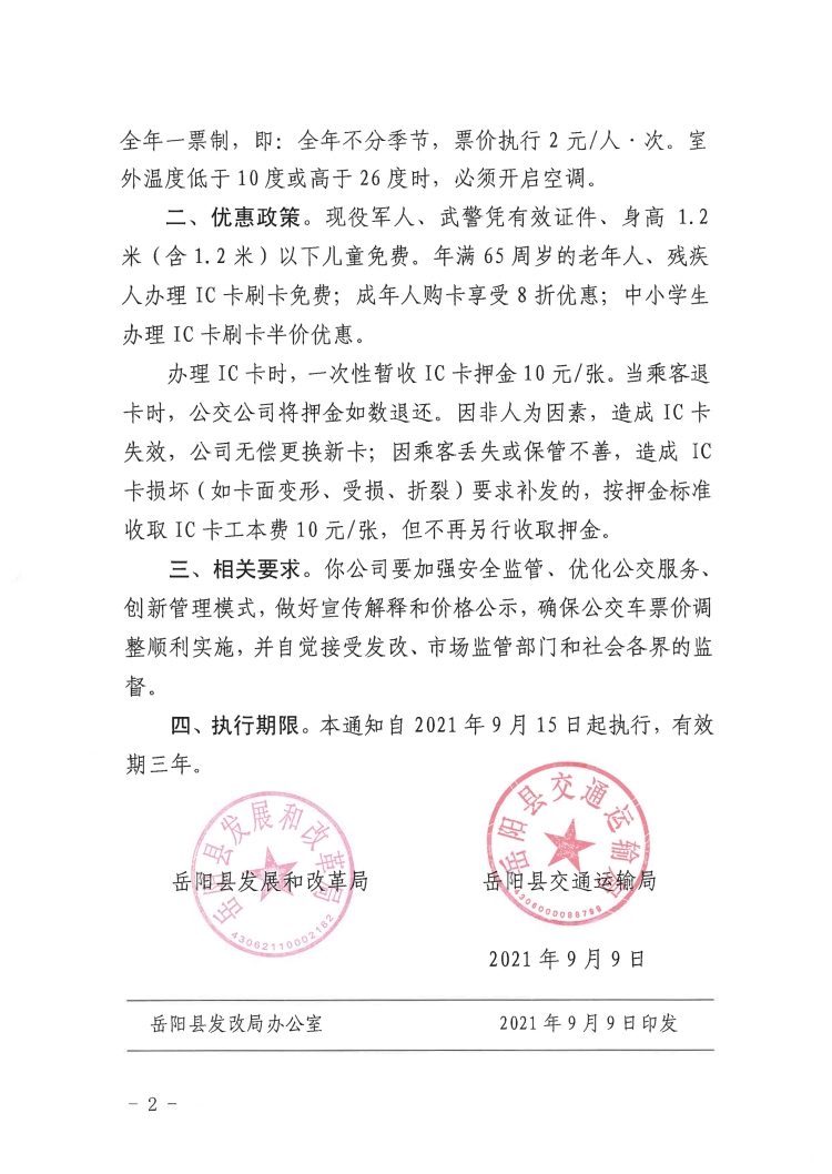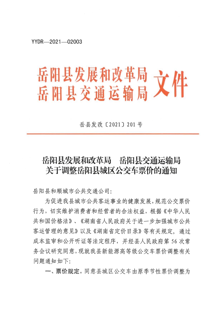 關於調整嶽陽縣城區公交車票價的通知