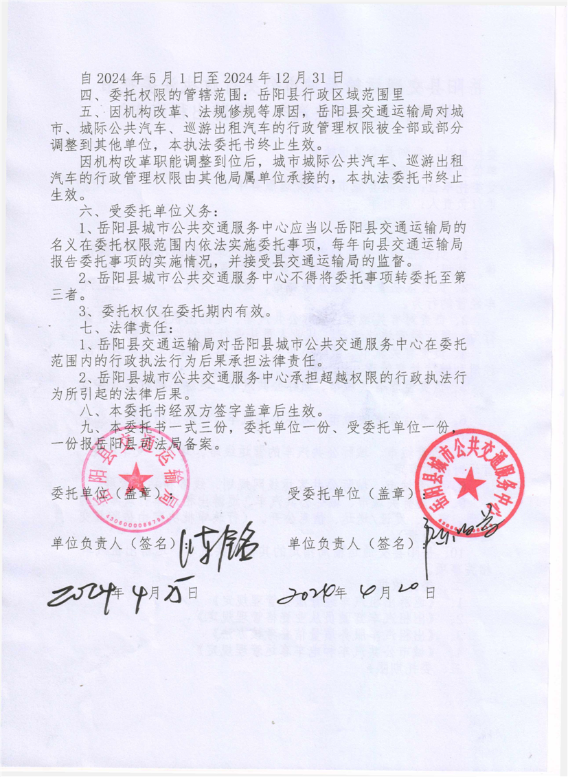 嶽陽縣交通運輸局城市公交行政執法委托書(城市、城際公共汽車、巡遊出租汽車)