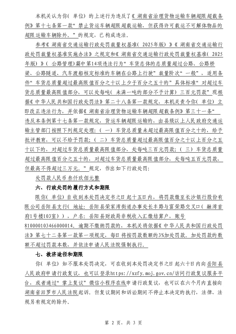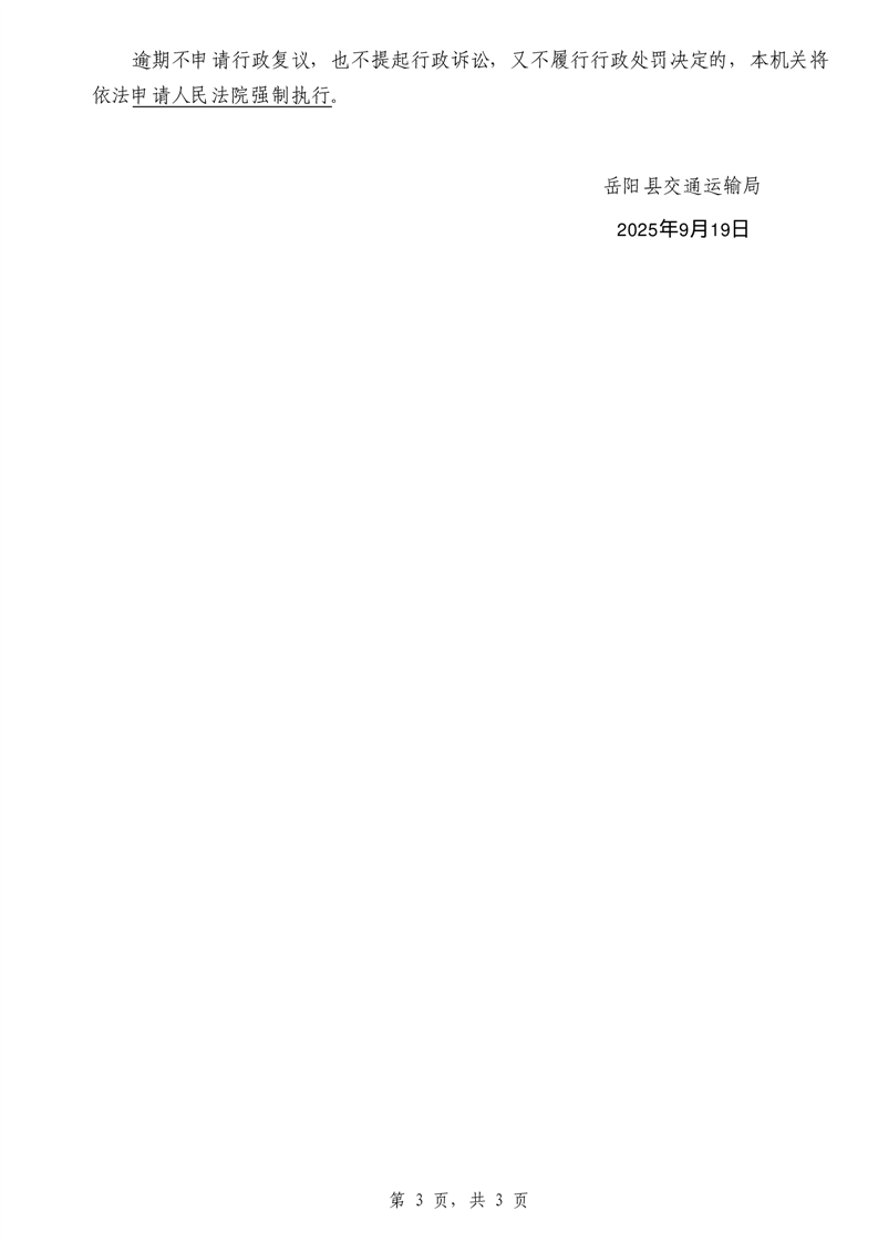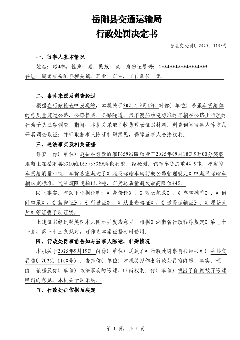 行政處罰決定書 嶽縣交處罰〔2025〕1108號