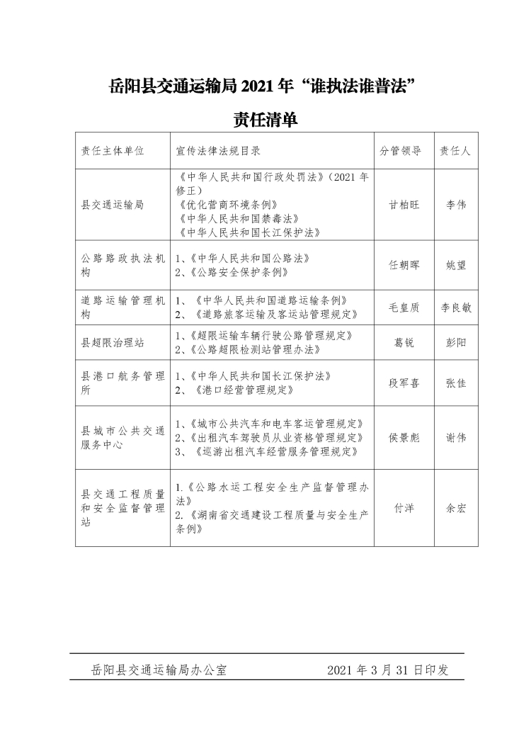 嶽陽縣交通運輸局2021年度“誰執法誰 普法”責任清單
