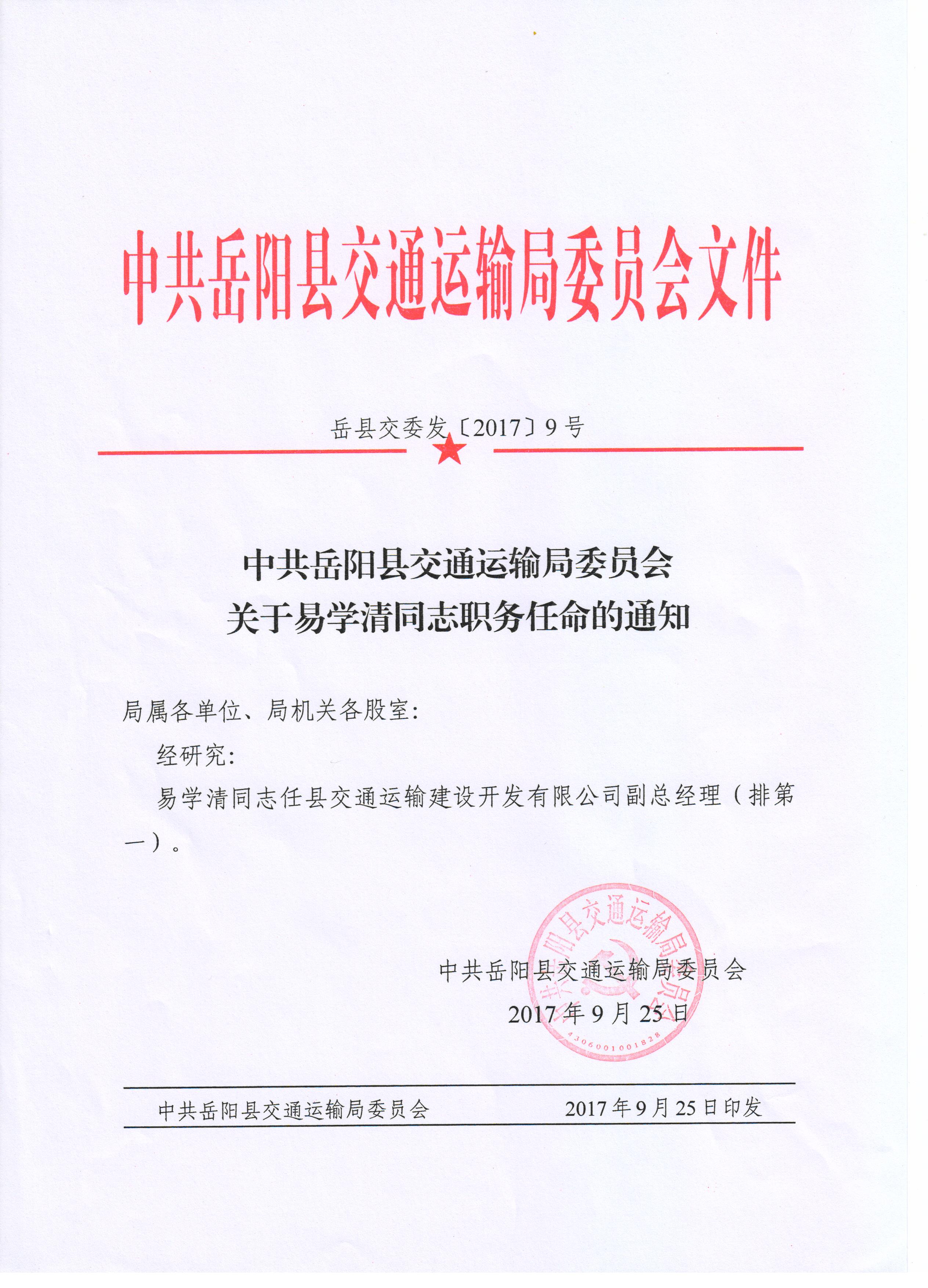 關於易學清同誌職務任命的通知