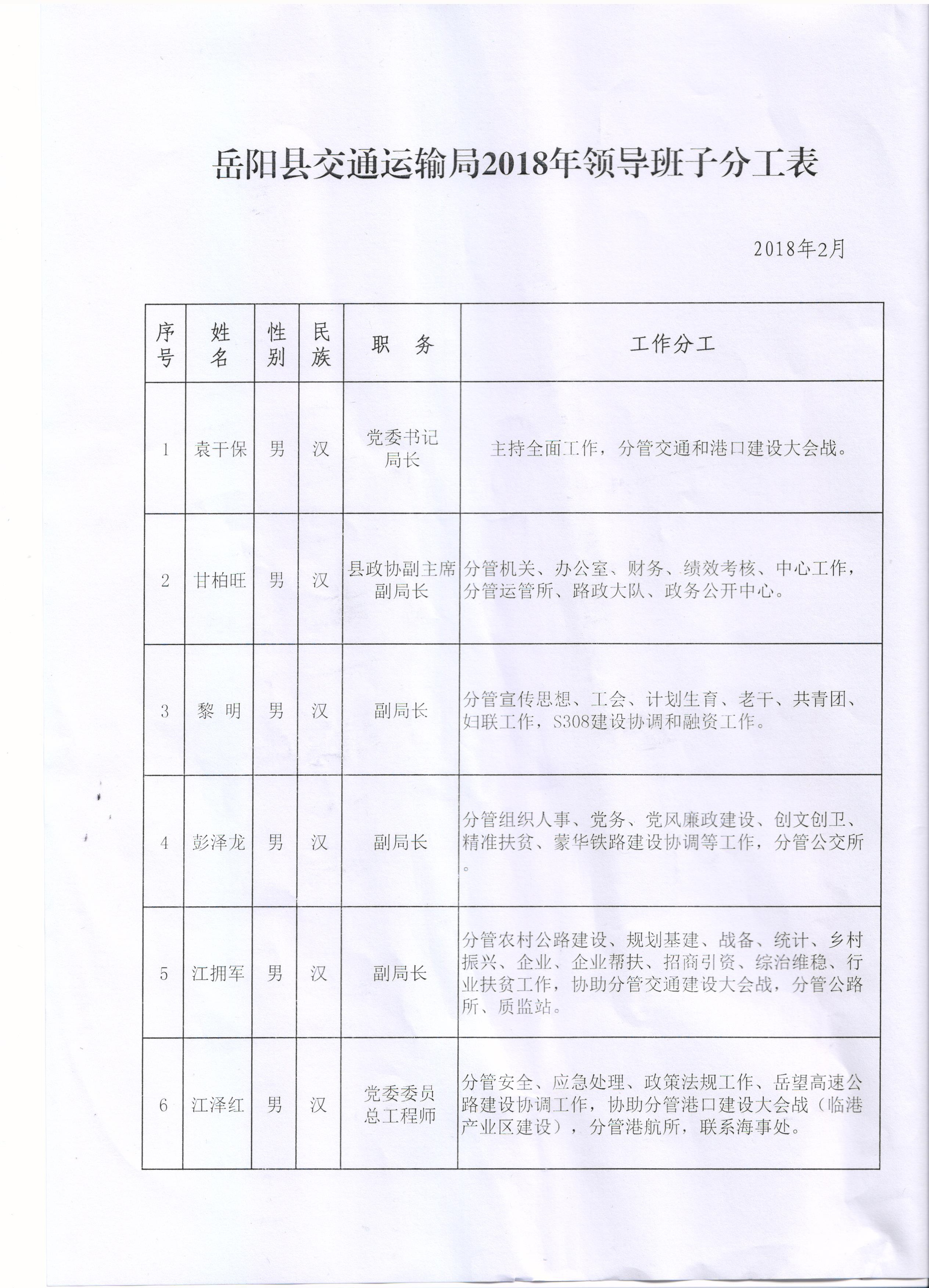 嶽陽縣交通運輸局2018年領導班子分工表(201802)