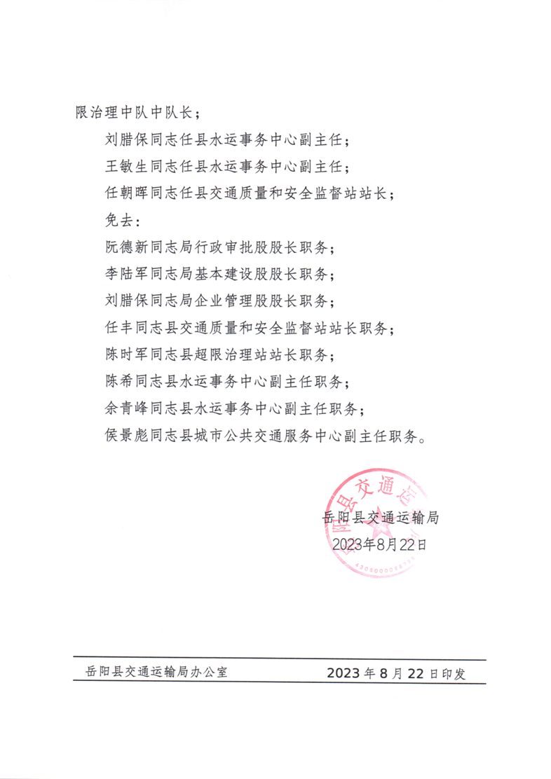 關於劉滔等同誌職務任免的通知 嶽縣交〔2023〕152號