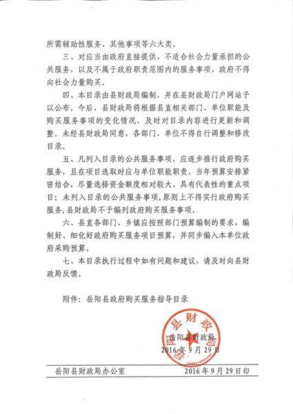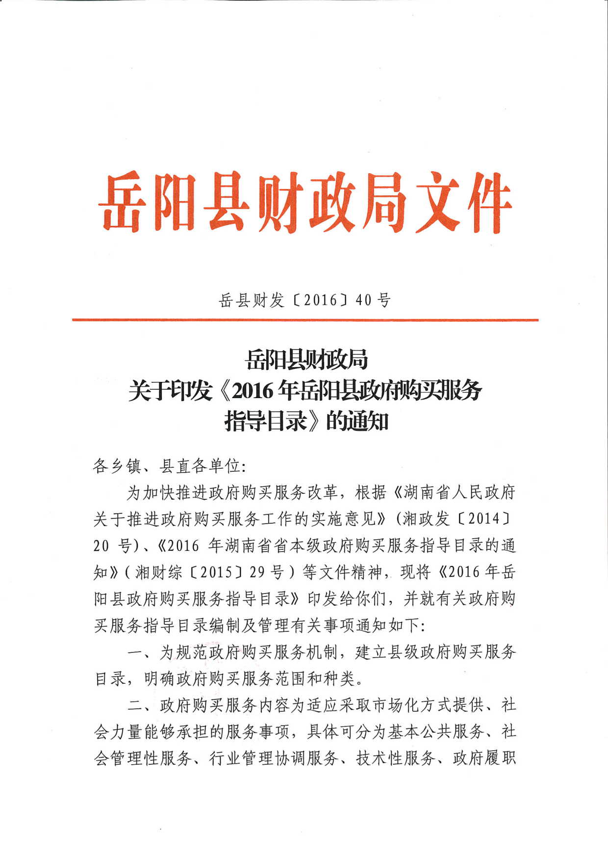 關於印發《2016年嶽陽縣政府購買服務指導目錄》的通知