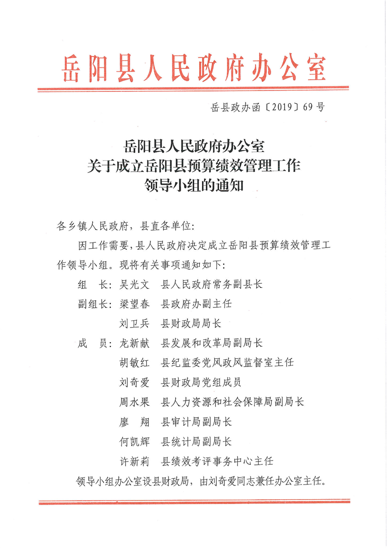 嶽陽縣人民政府關於成立縣預算績效管理工作領導小組的通知