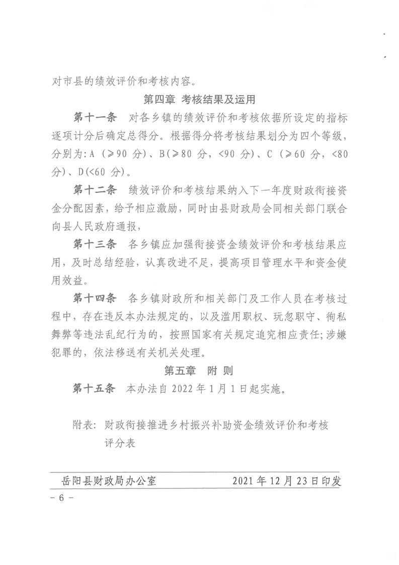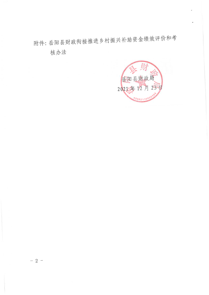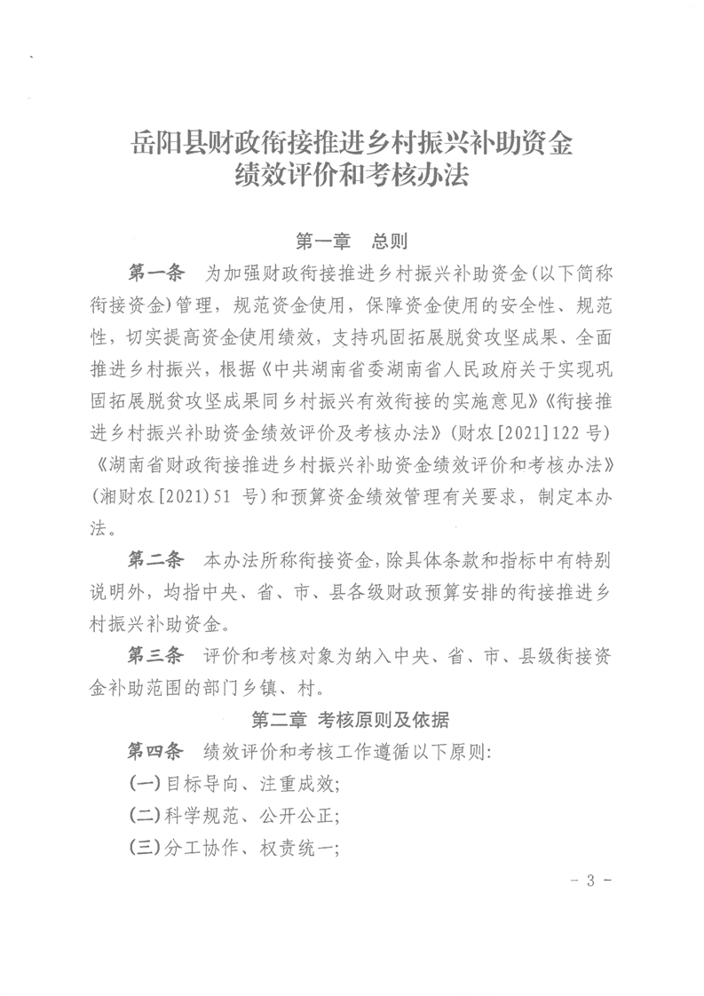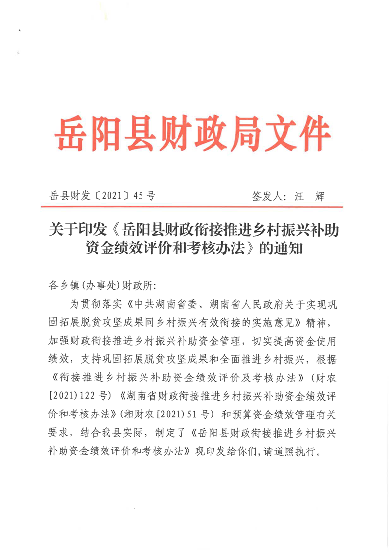 關於印發《嶽陽縣財政銜接推進鄉村振興補助資金績效評價和考核辦法》的通知