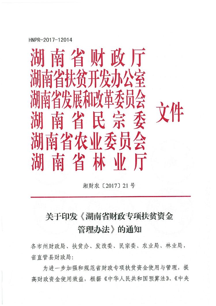 關於印發《湖南省財政專項扶貧資金管理辦法的通知》(湘財農[2017]21號)