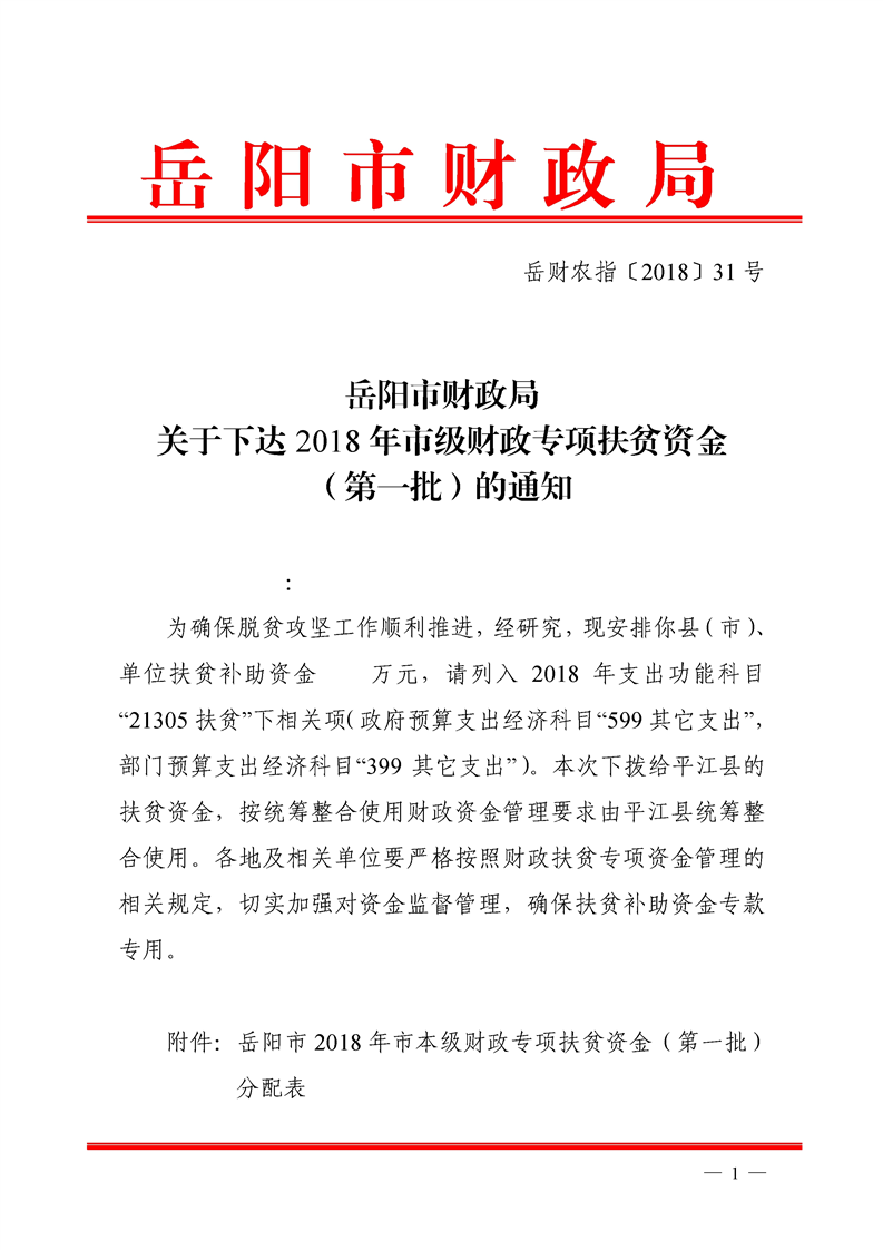 | 平江縣 | 650 | 600 | 40 | 10 | 640萬元用於精準扶貧,總隊經費撥上塔市鎮、福壽山鎮各5萬元。 | ||