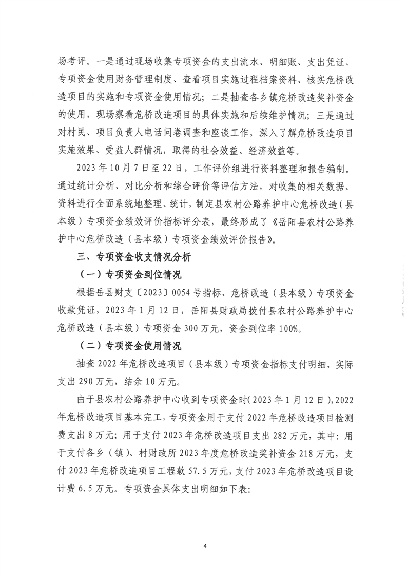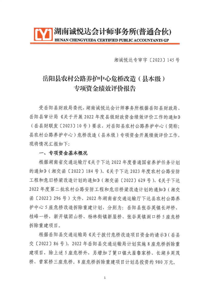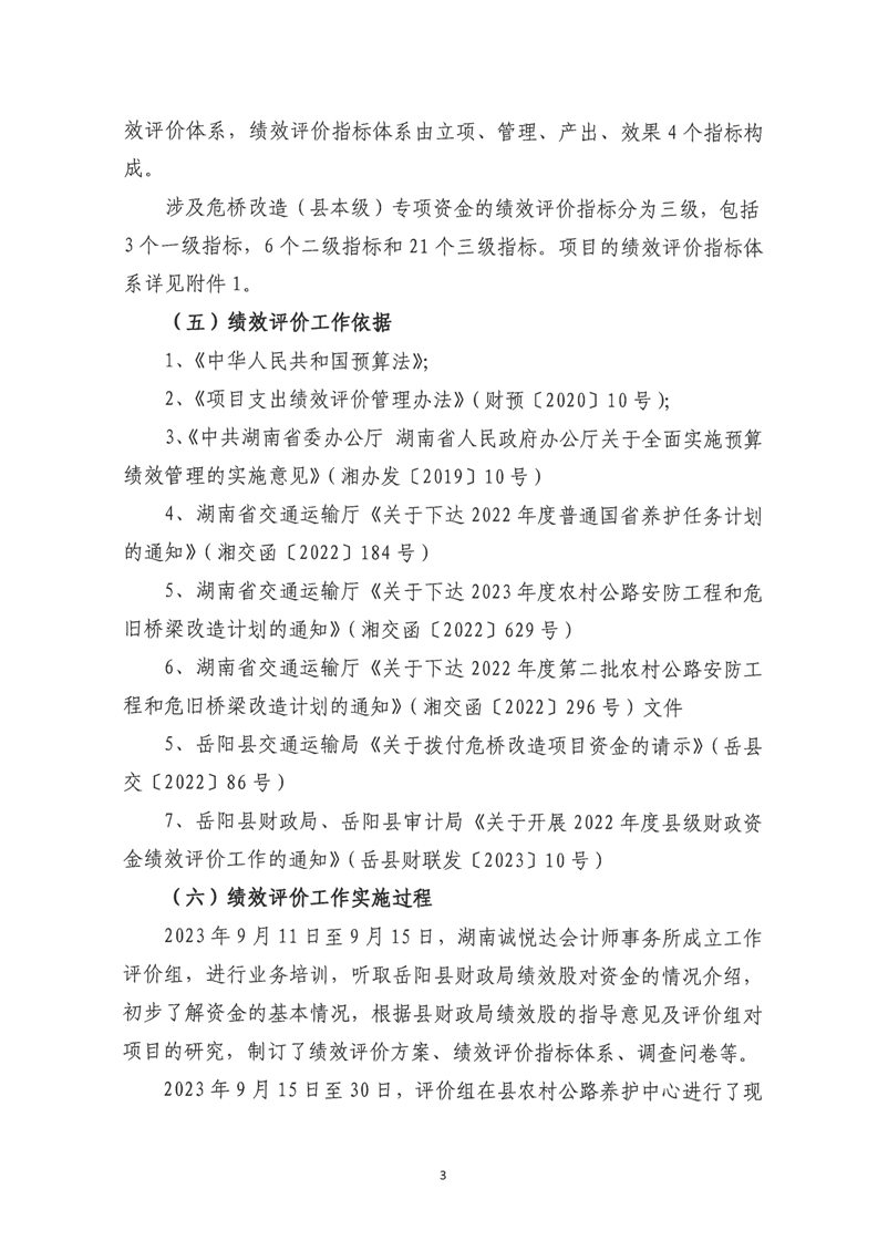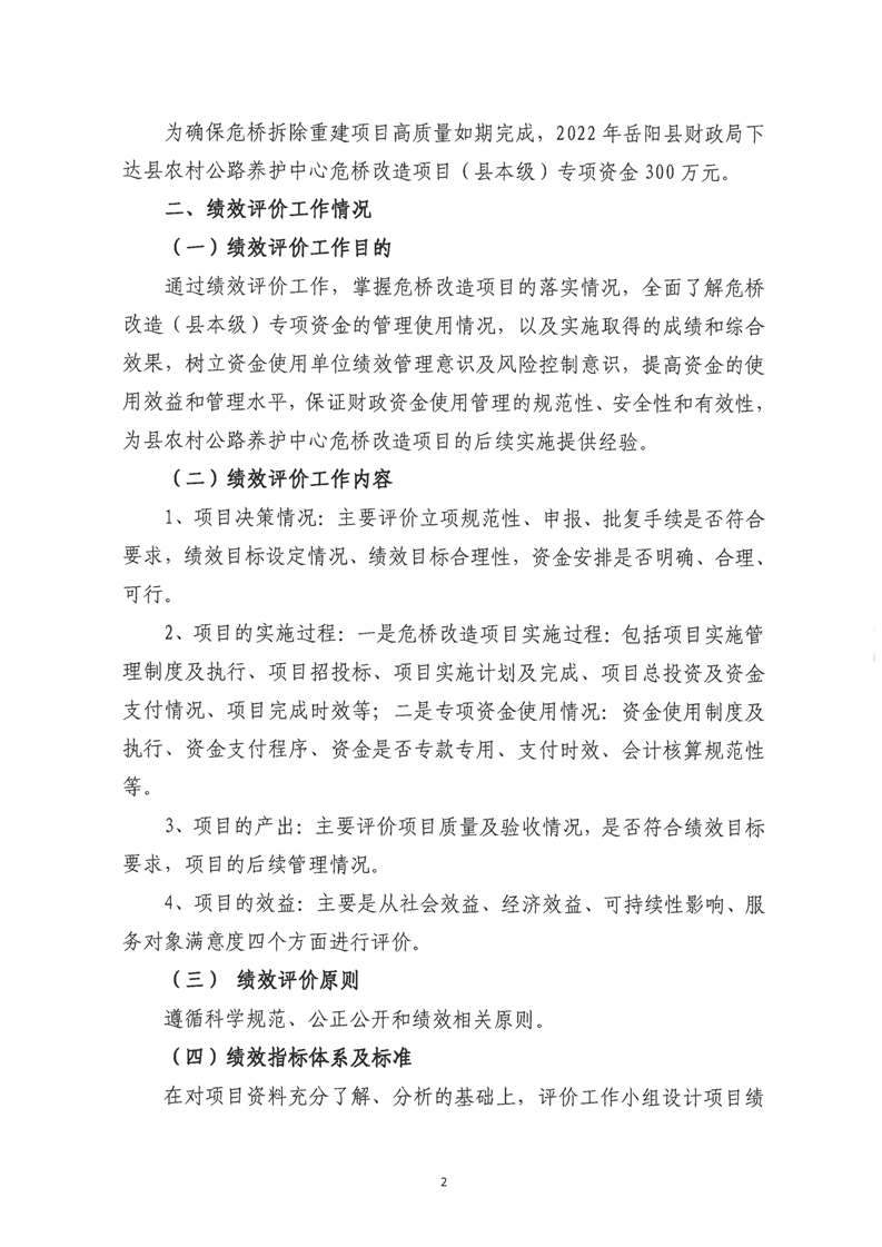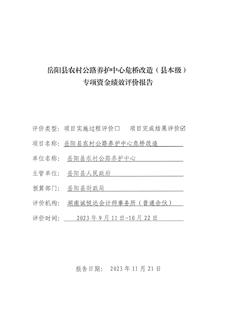 嶽陽縣農村公路養護中心危橋改造(縣本級)專項資金績效評價報告